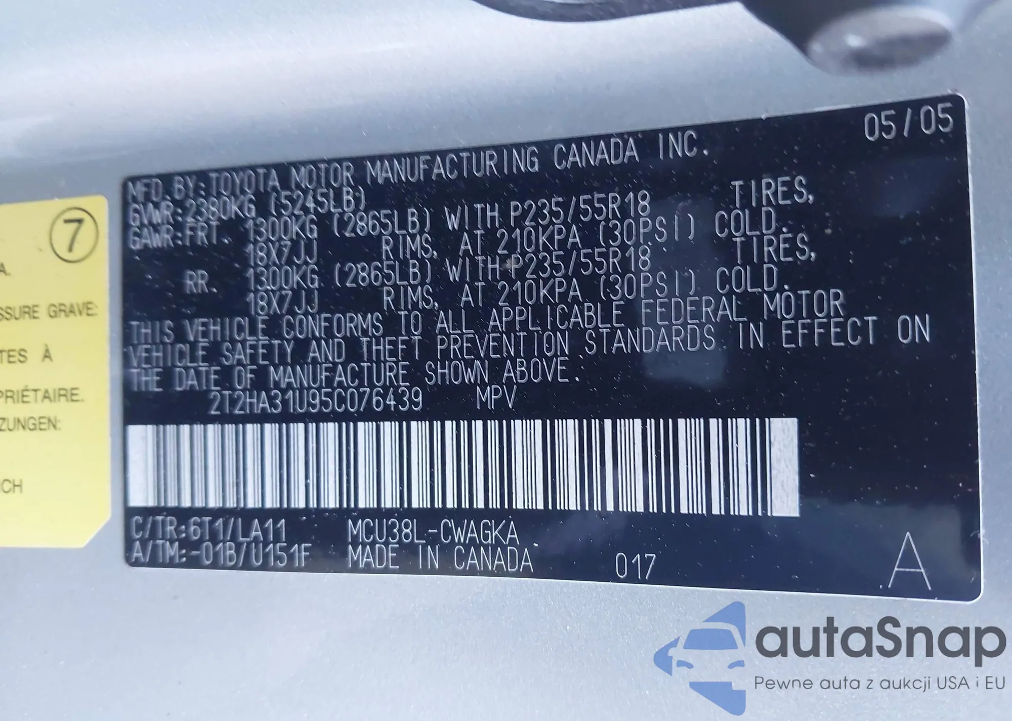• VIN 2T2HA31U95C076439