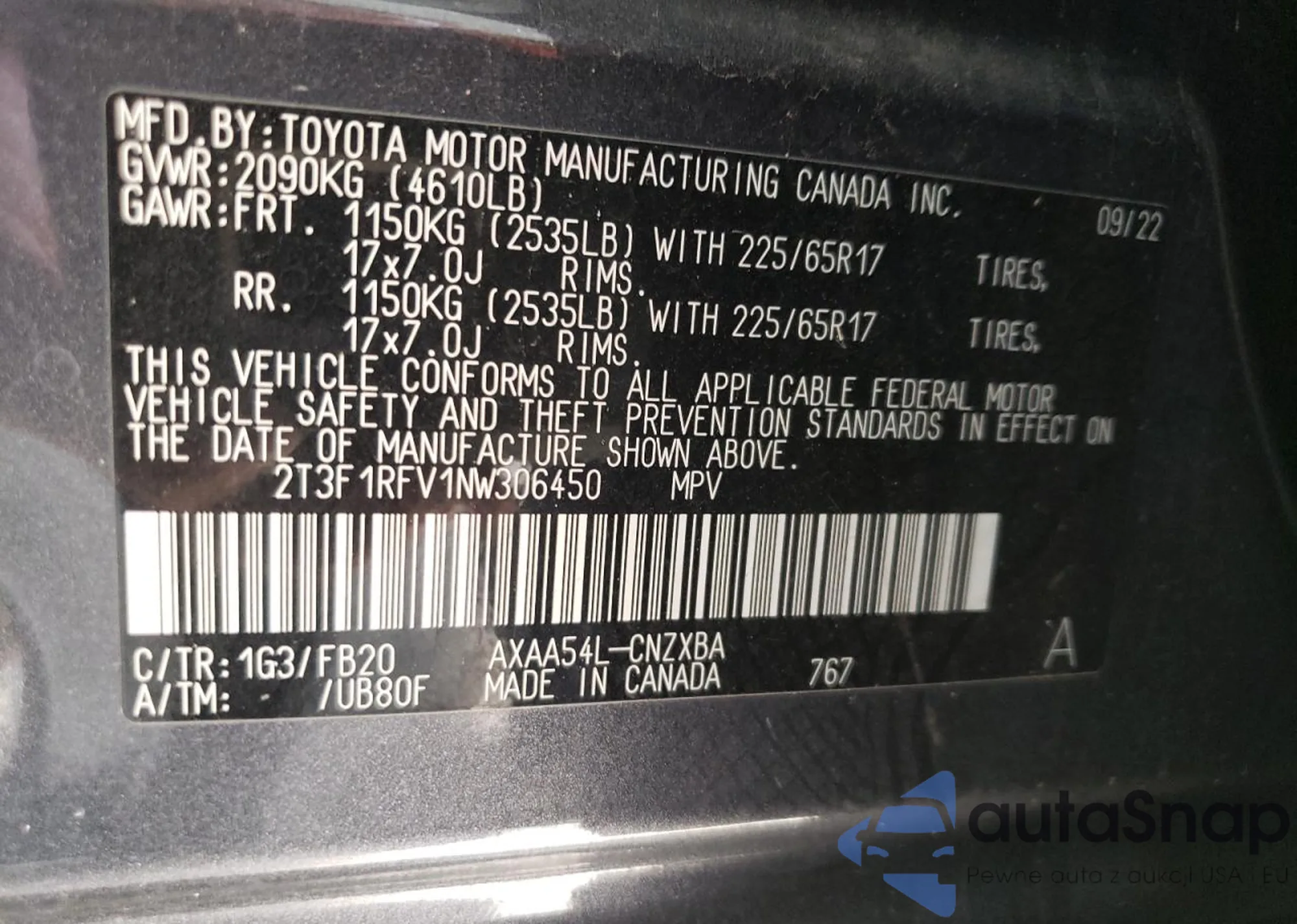 • VIN 2T3F1RFV1NW306450