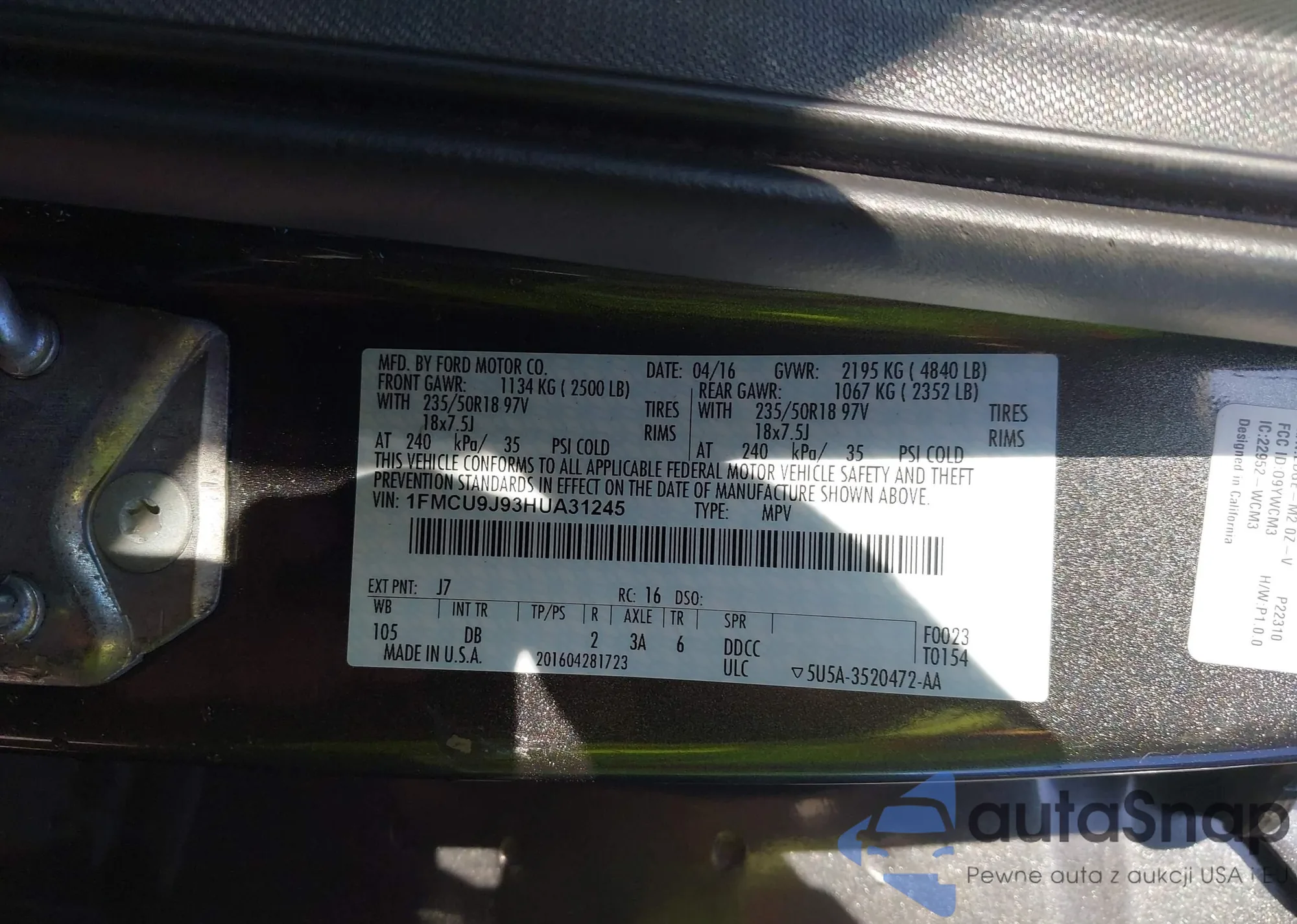 • VIN 1FMCU9J93HUA31245