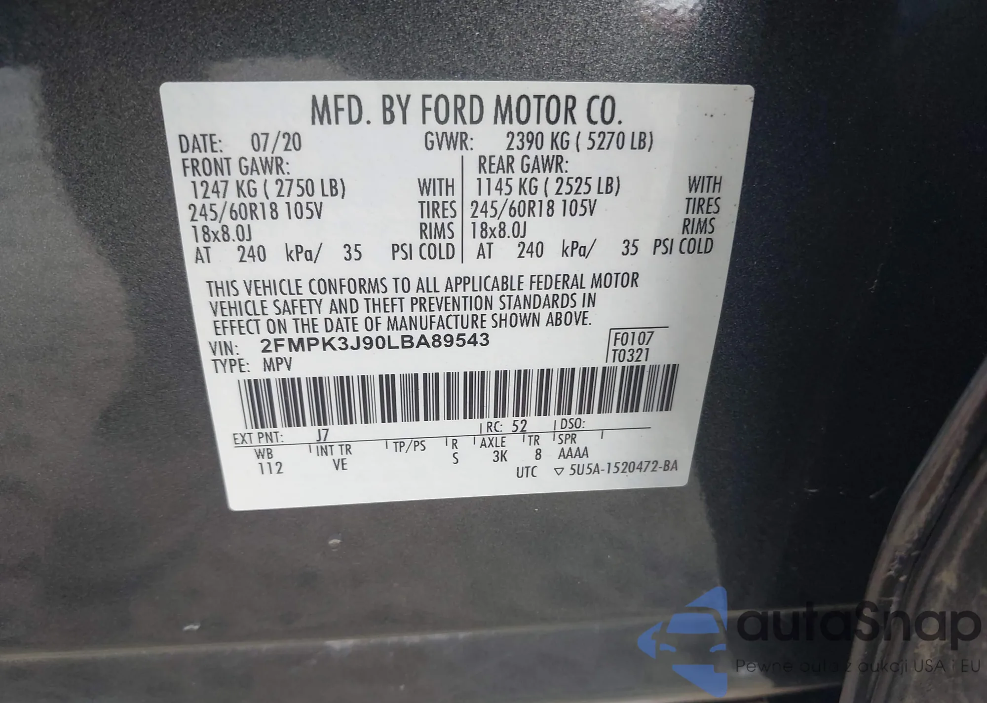 • VIN 2FMPK3J90LBA89543