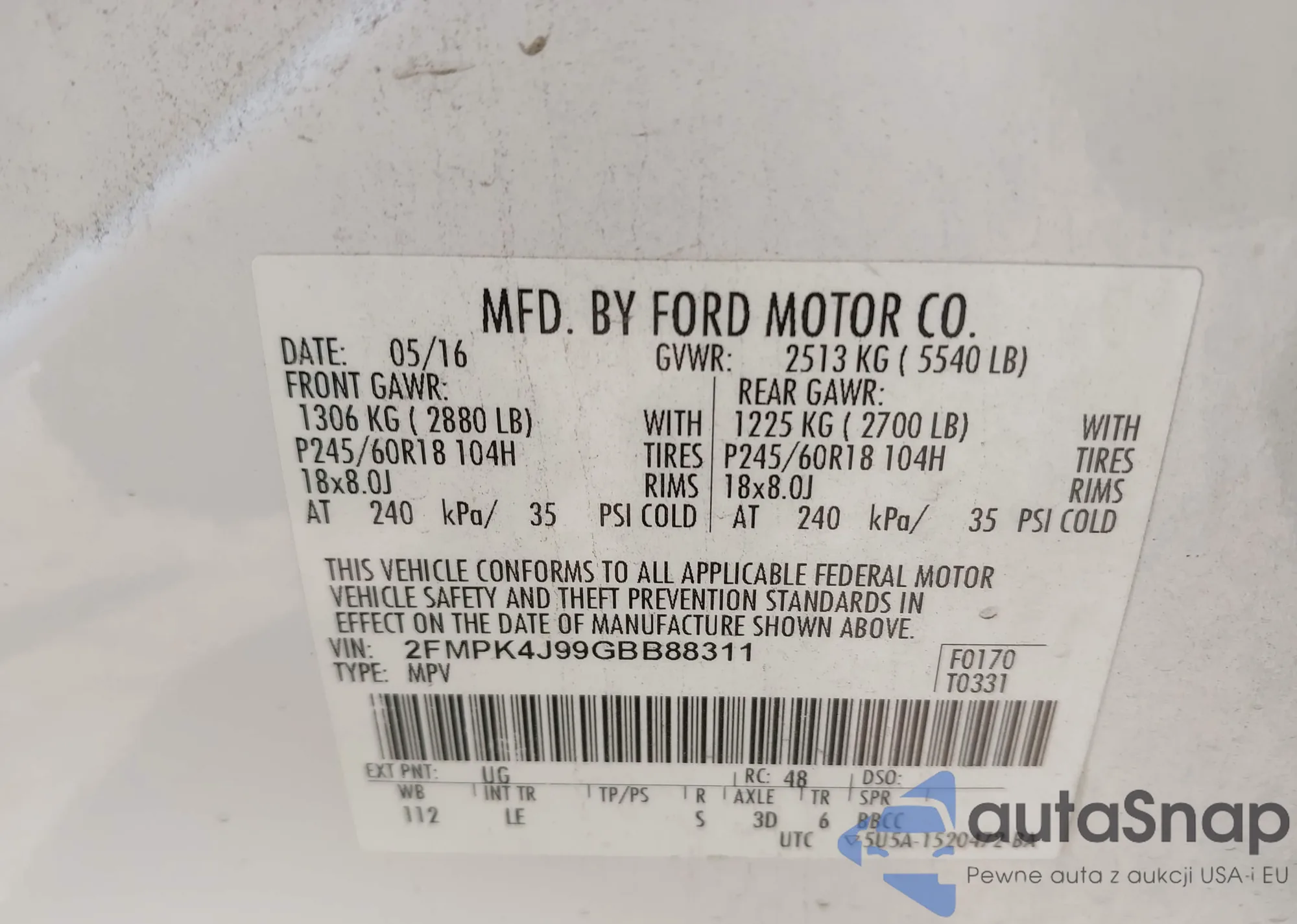 LOT: 43098319 VIN: 2FMPK4J99GBB88311