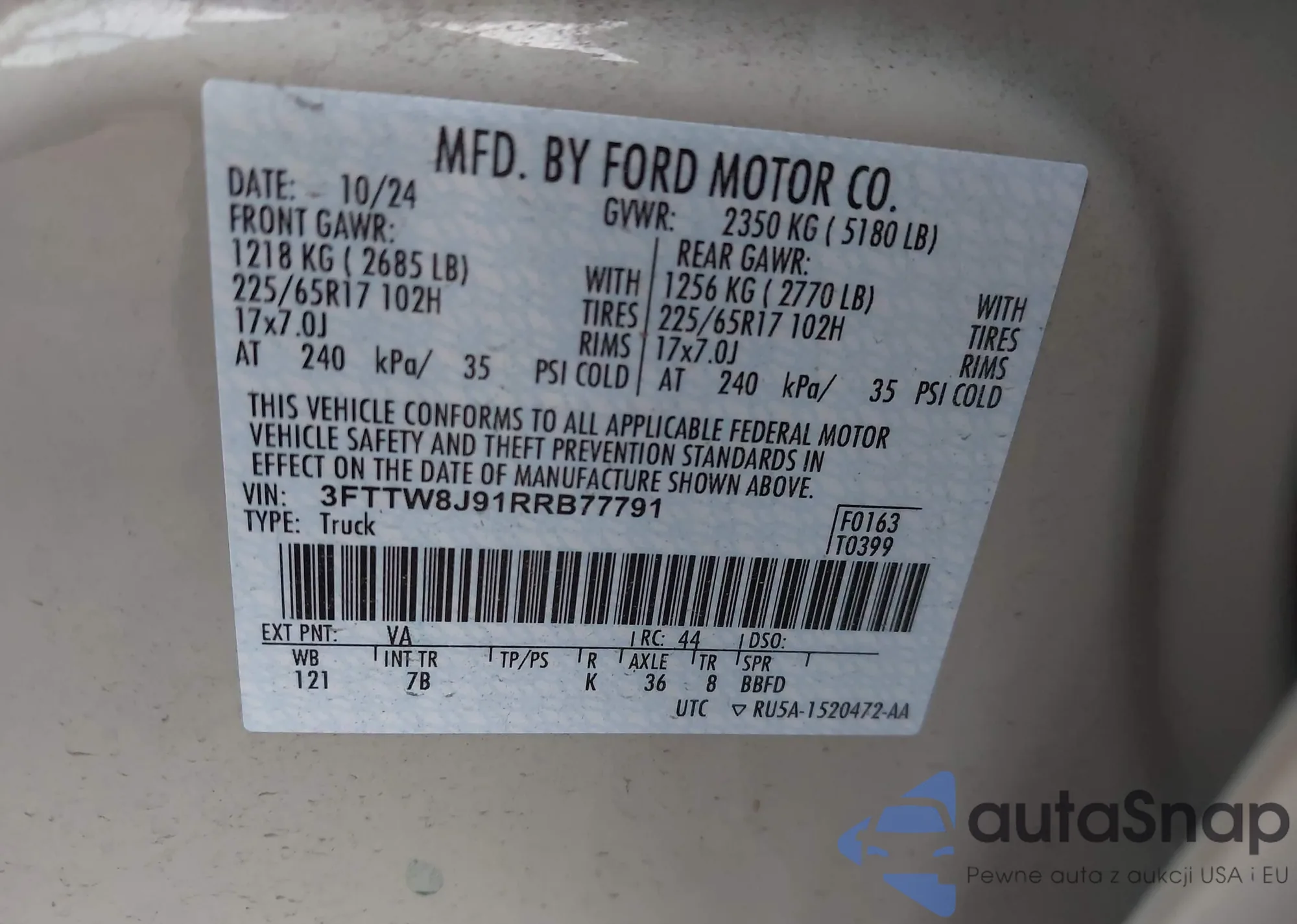 • VIN 3FTTW8J91RRB77791