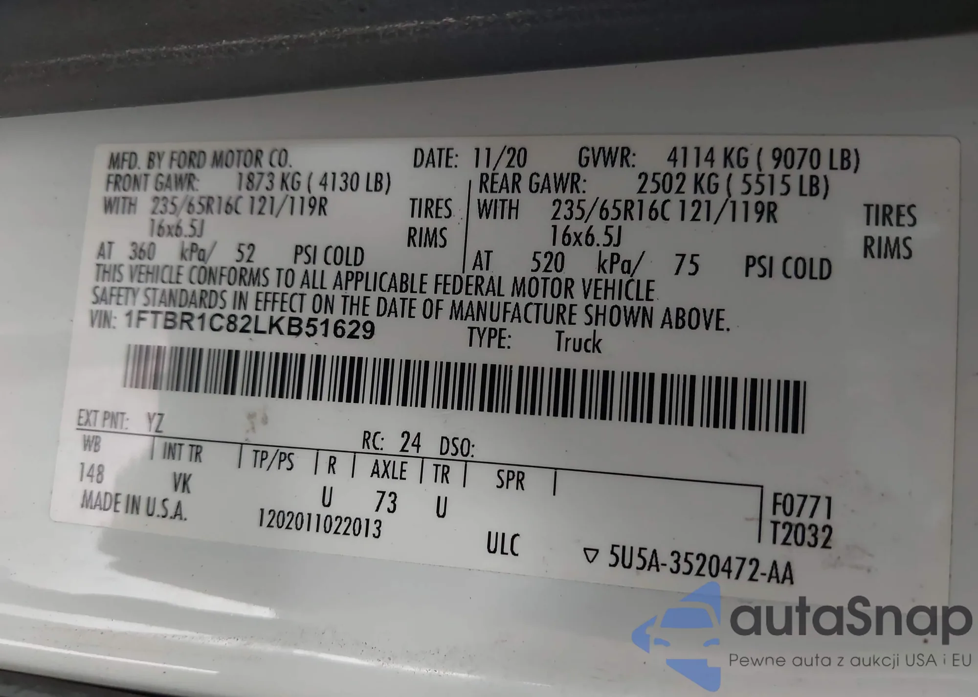 LOT: 43303470 VIN: 1FTBR1C82LKB51629