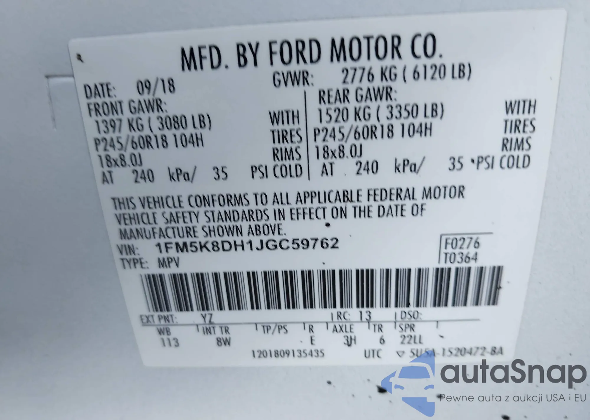 LOT: 43335442 VIN: 1FM5K8DH1JGC59762