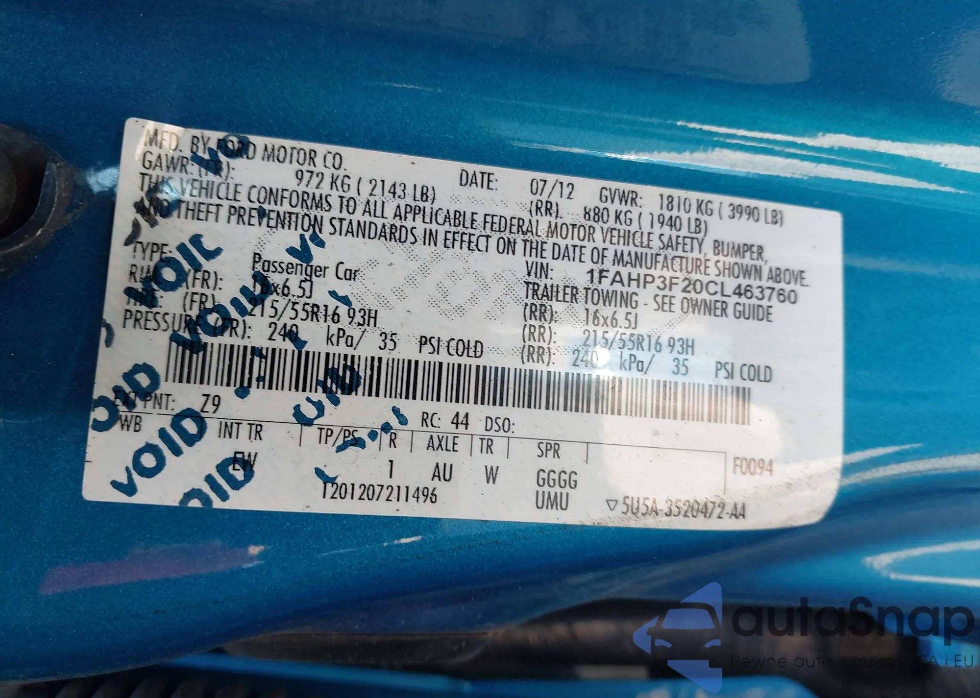 • VIN 1FAHP3F20CL463760
