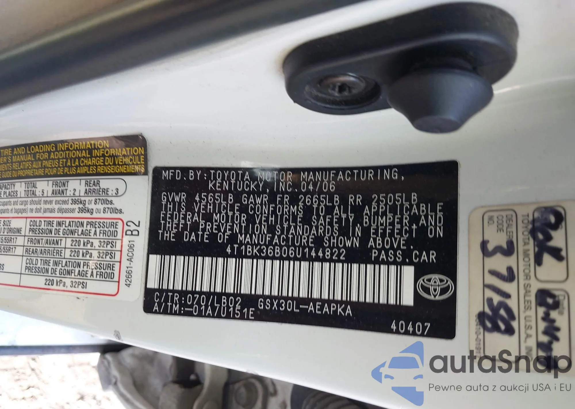 LOT: 41769878 VIN: 4T1BK36B06U144822