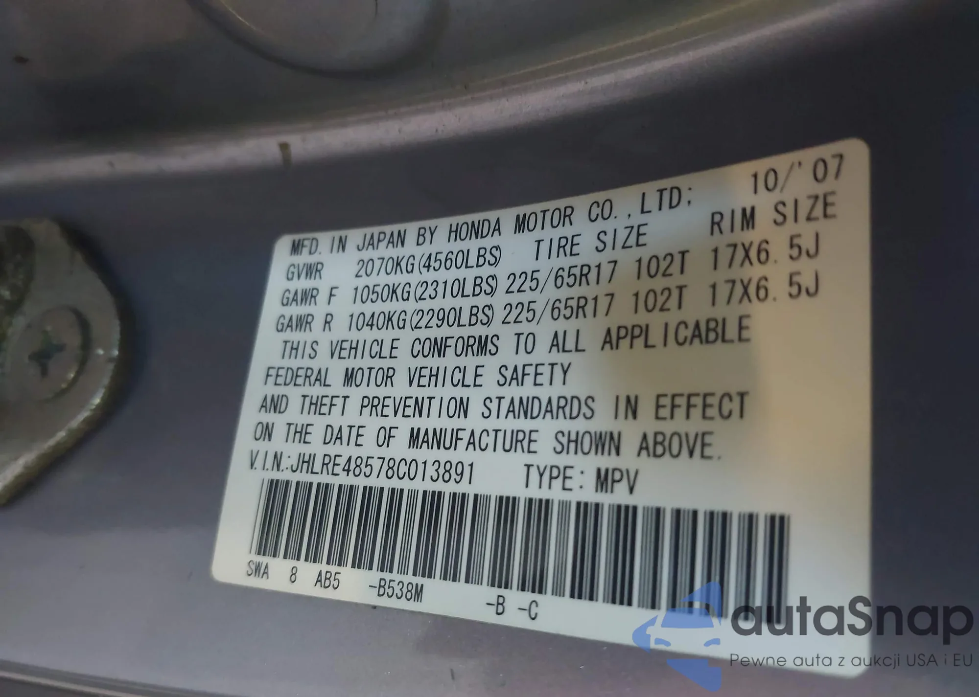 LOT: 43120732 VIN: JHLRE48578C013891