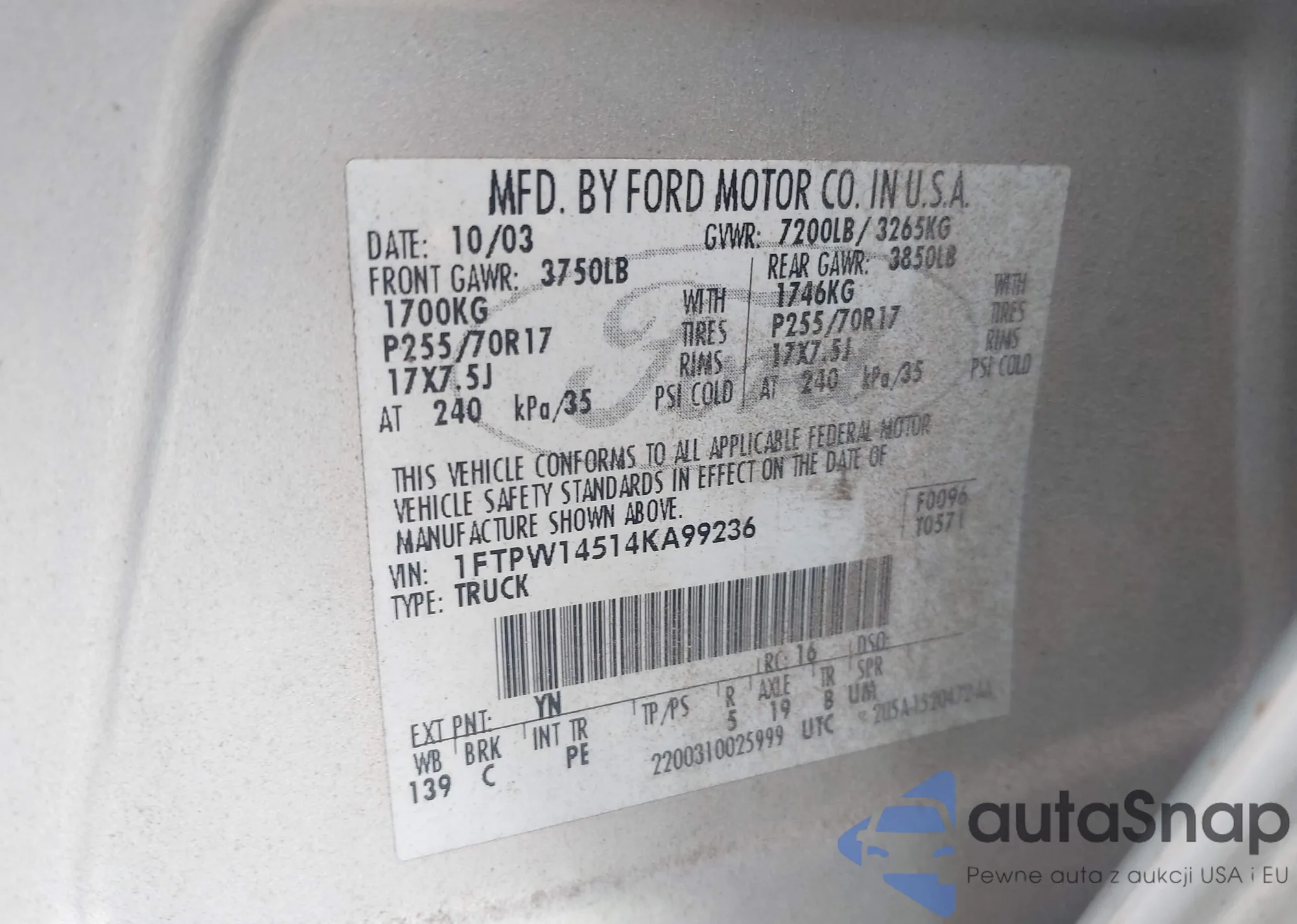 LOT: 43324224 VIN: 1FTPW14514KA99236