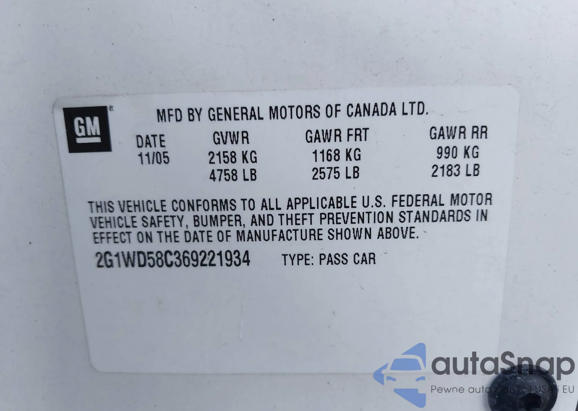 • VIN 2G1WD58C369221934