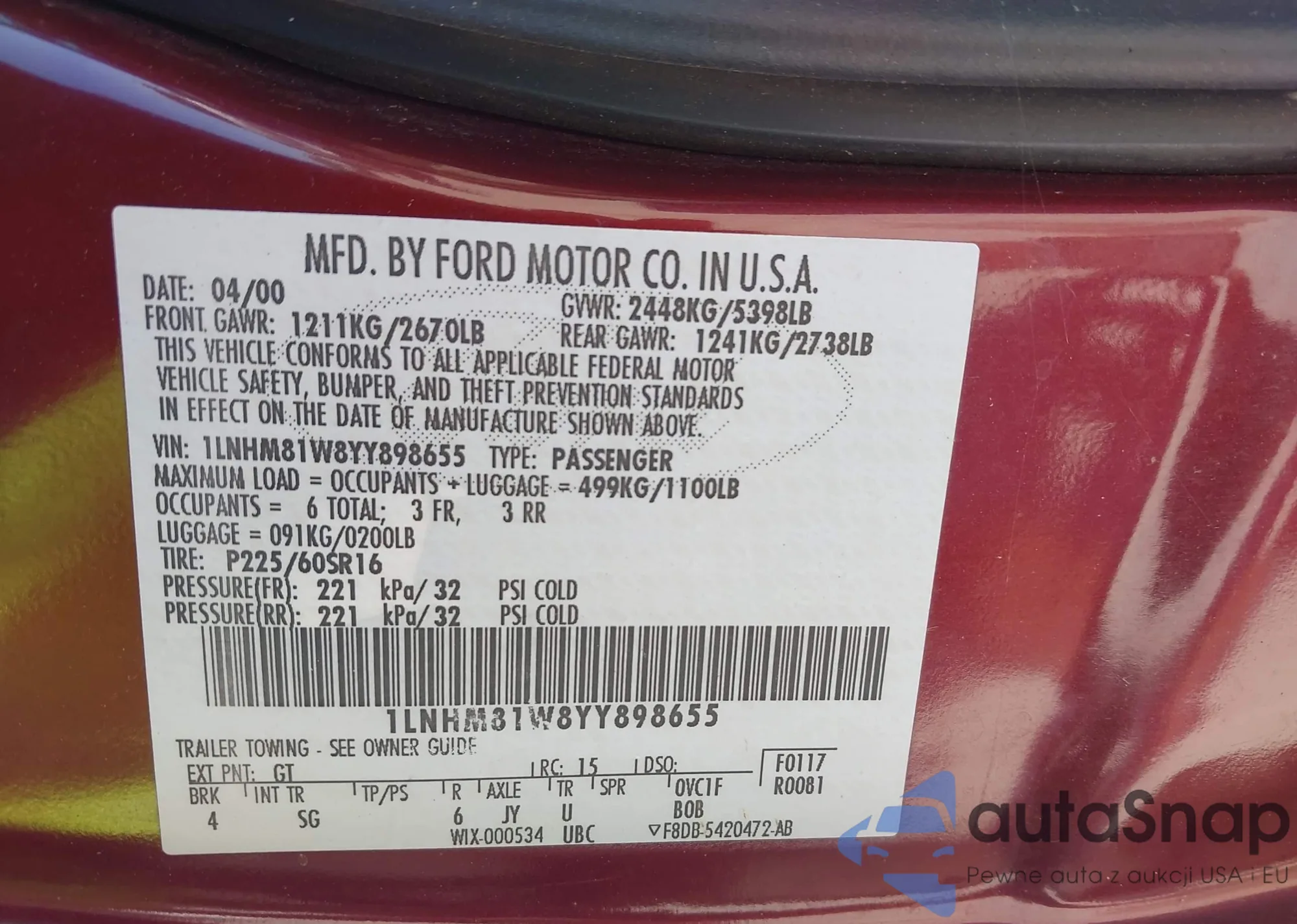 LOT: 43086094 VIN: 1LNHM81W8YY898655