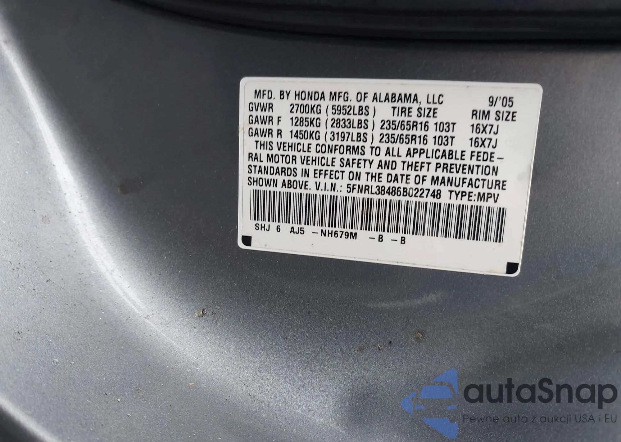 • VIN 5FNRL38486B022748
