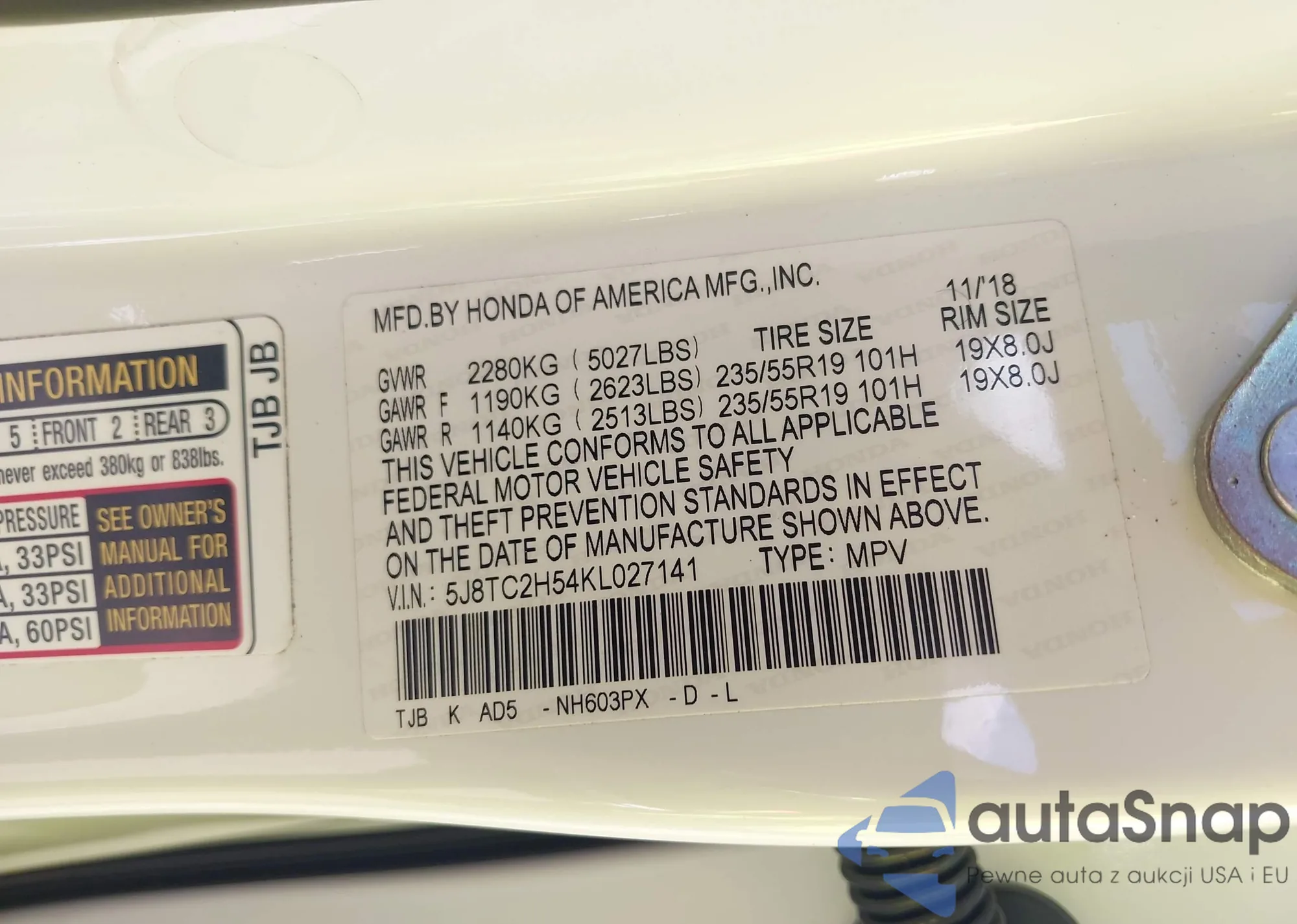 • VIN 5J8TC2H54KL027141