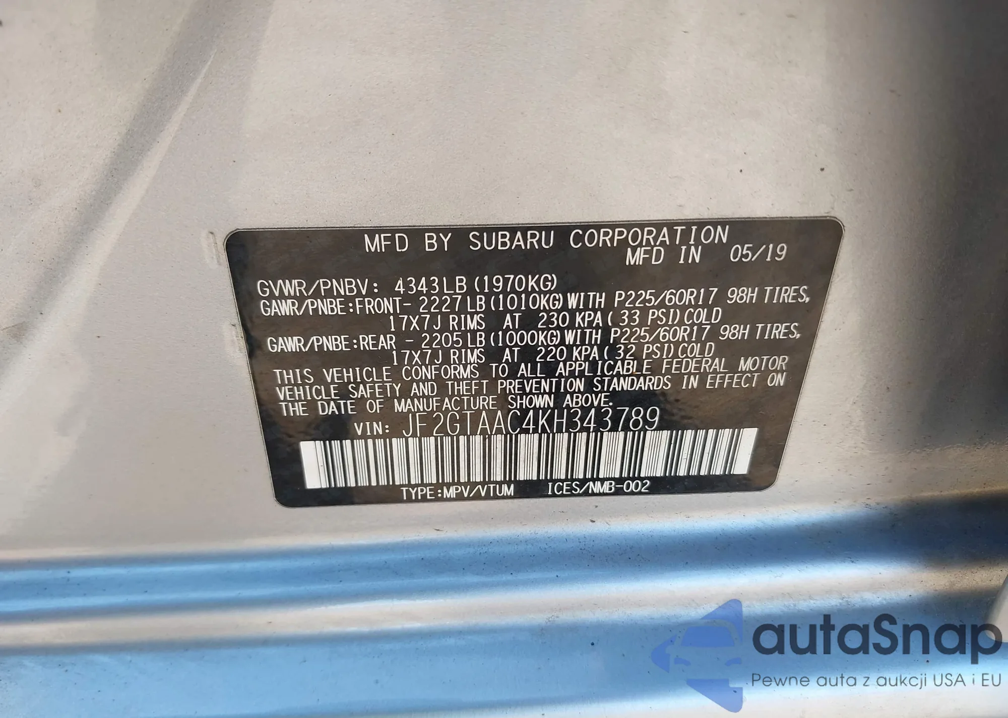 • VIN JF2GTAAC4KH343789