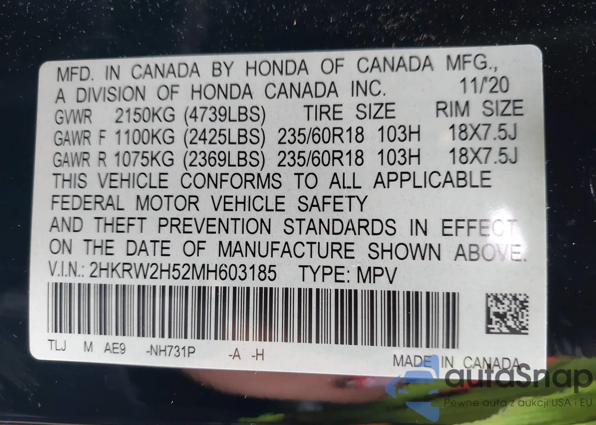 • VIN 2HKRW2H52MH603185