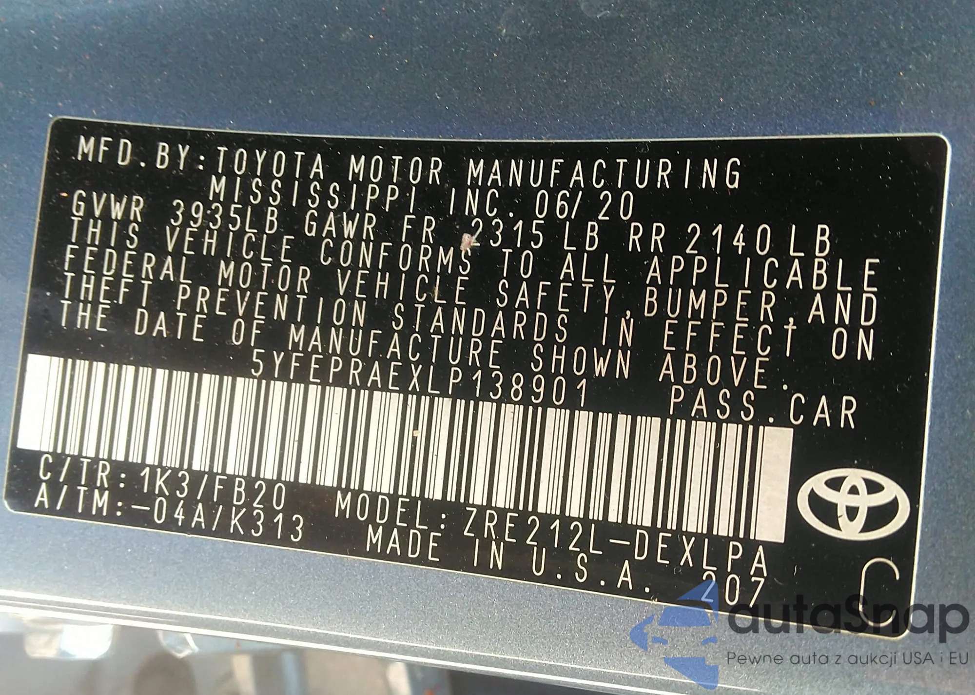 LOT: 43142097 VIN: 5YFEPRAEXLP138901