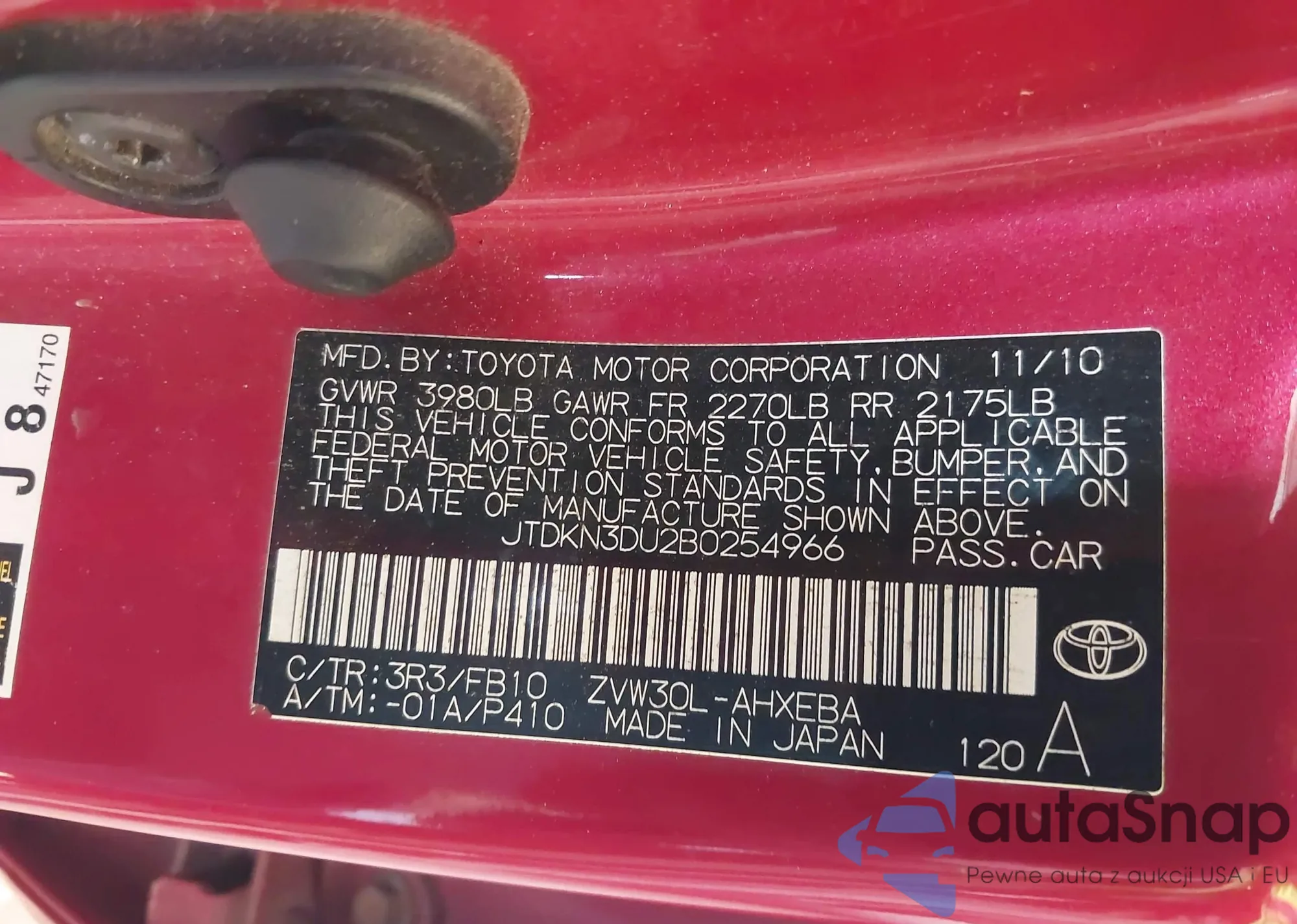LOT: 43296194 VIN: JTDKN3DU2B0254966