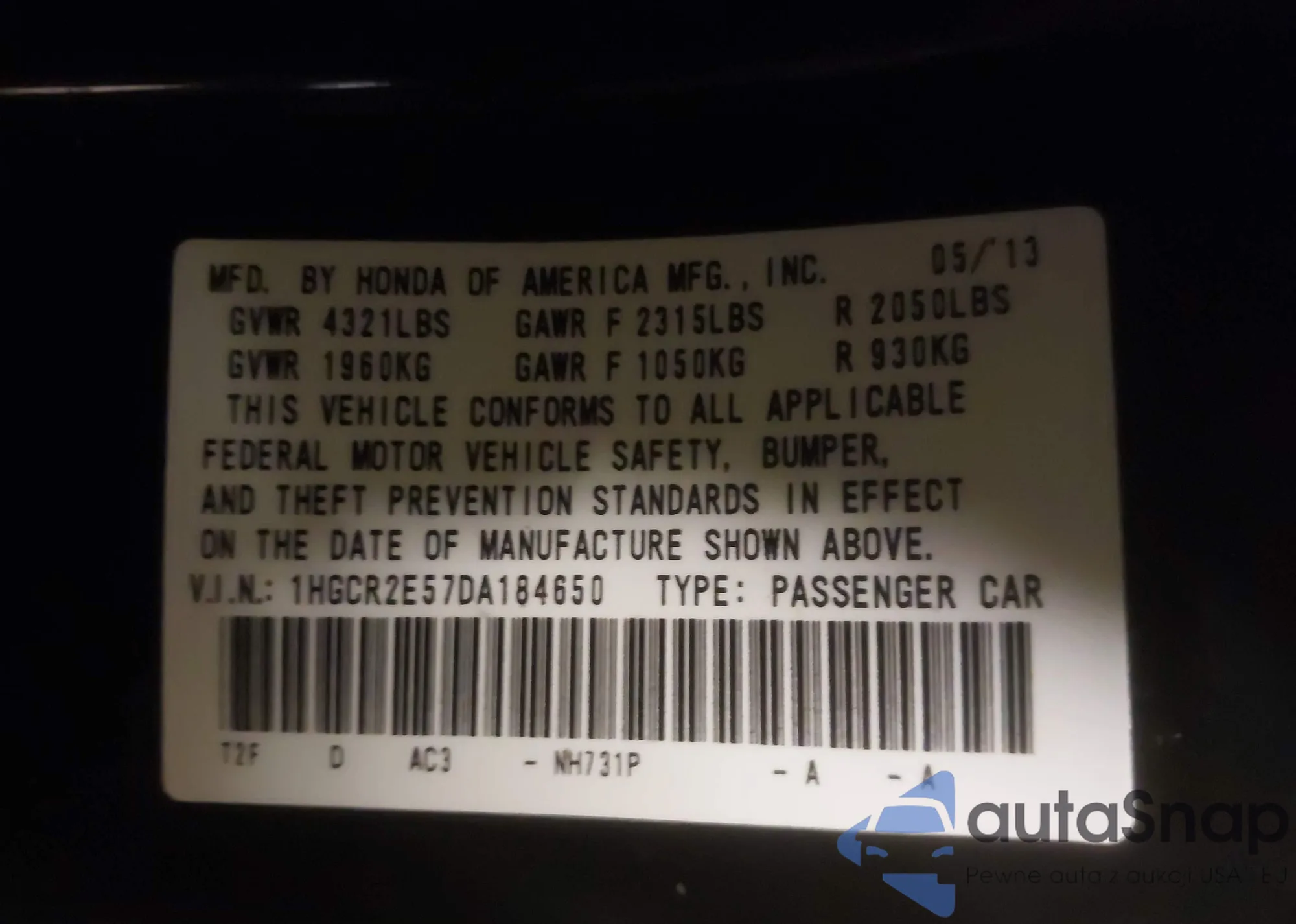 • VIN 1HGCR2E57DA184650