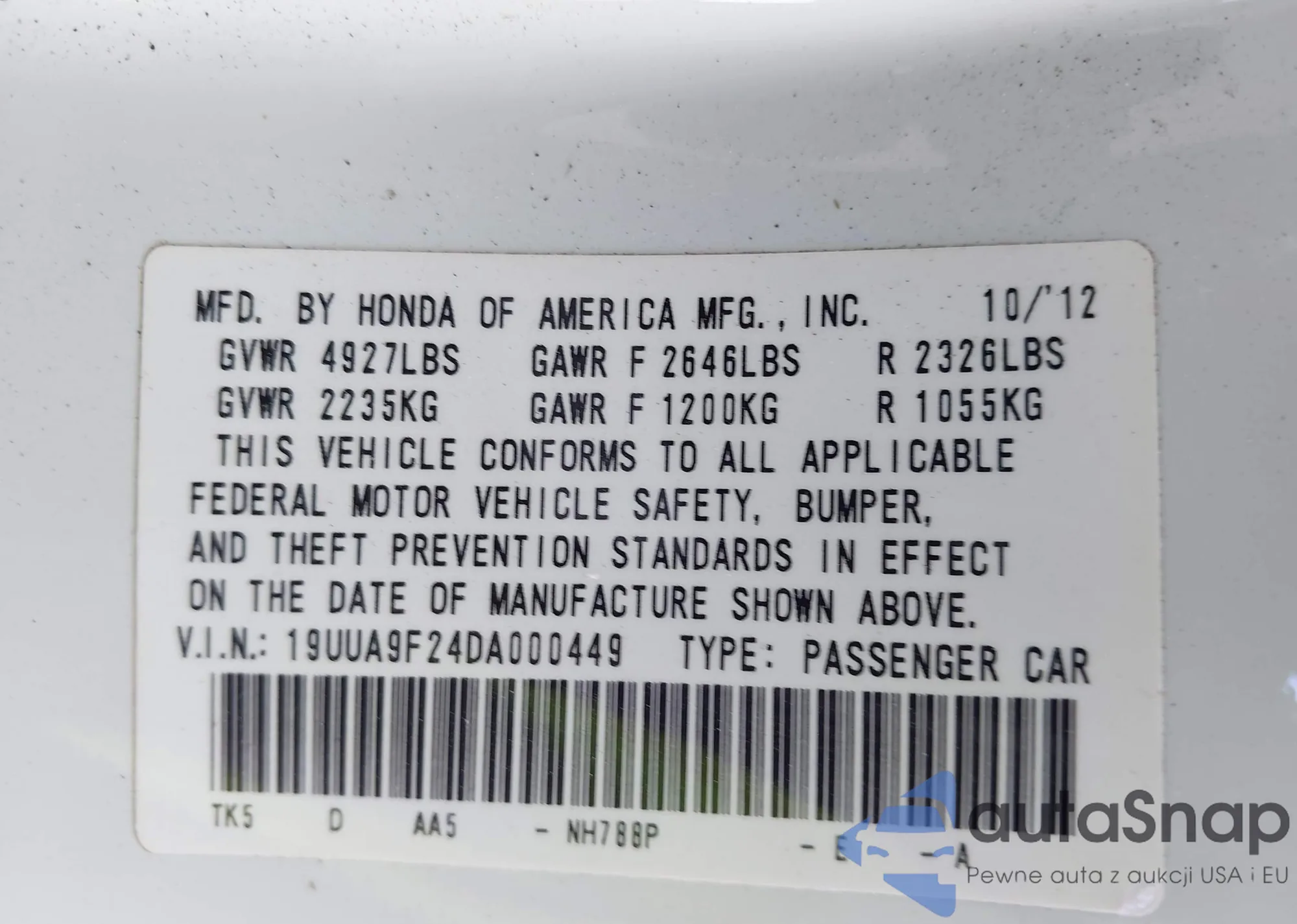 LOT: 43234230 VIN: 19UUA9F24DA000449