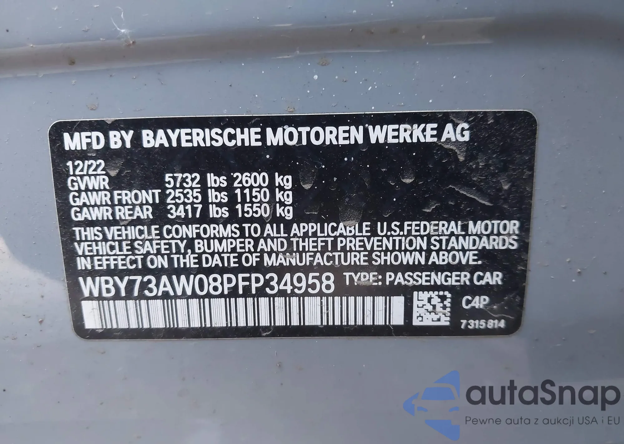 LOT: 43422278 VIN: WBY73AW08PFP34958
