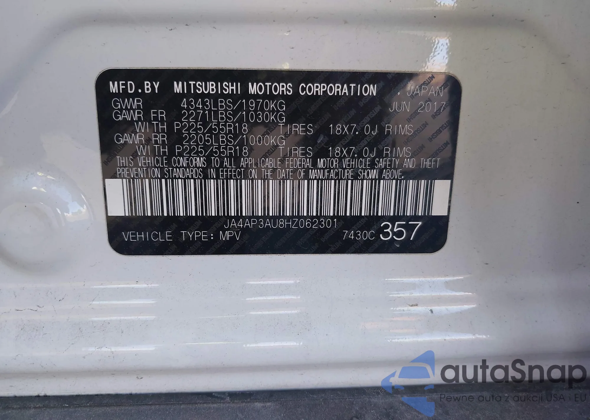 LOT: 43487752 VIN: JA4AP3AU8HZ062301