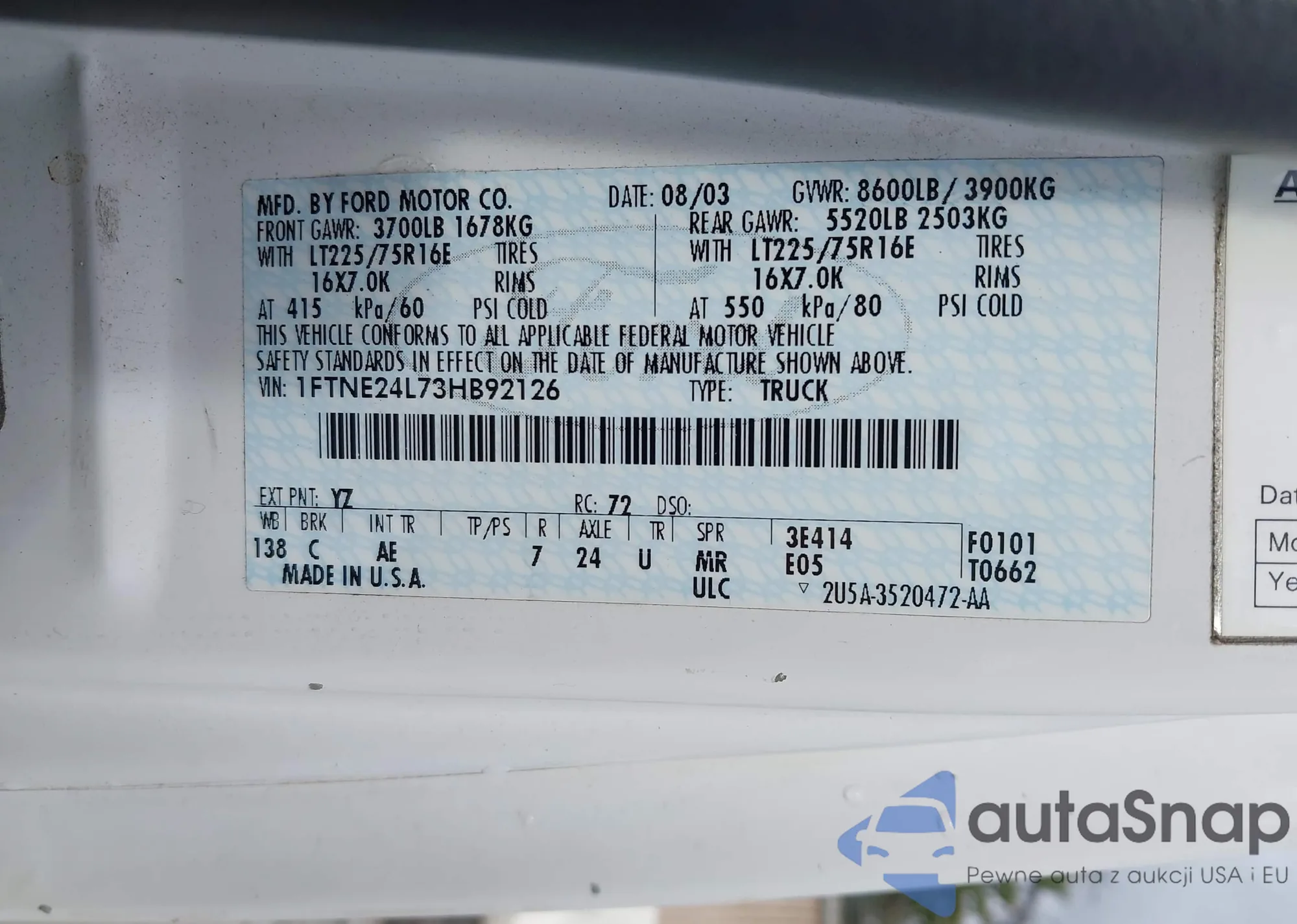 • VIN 1FTNE24L73HB92126