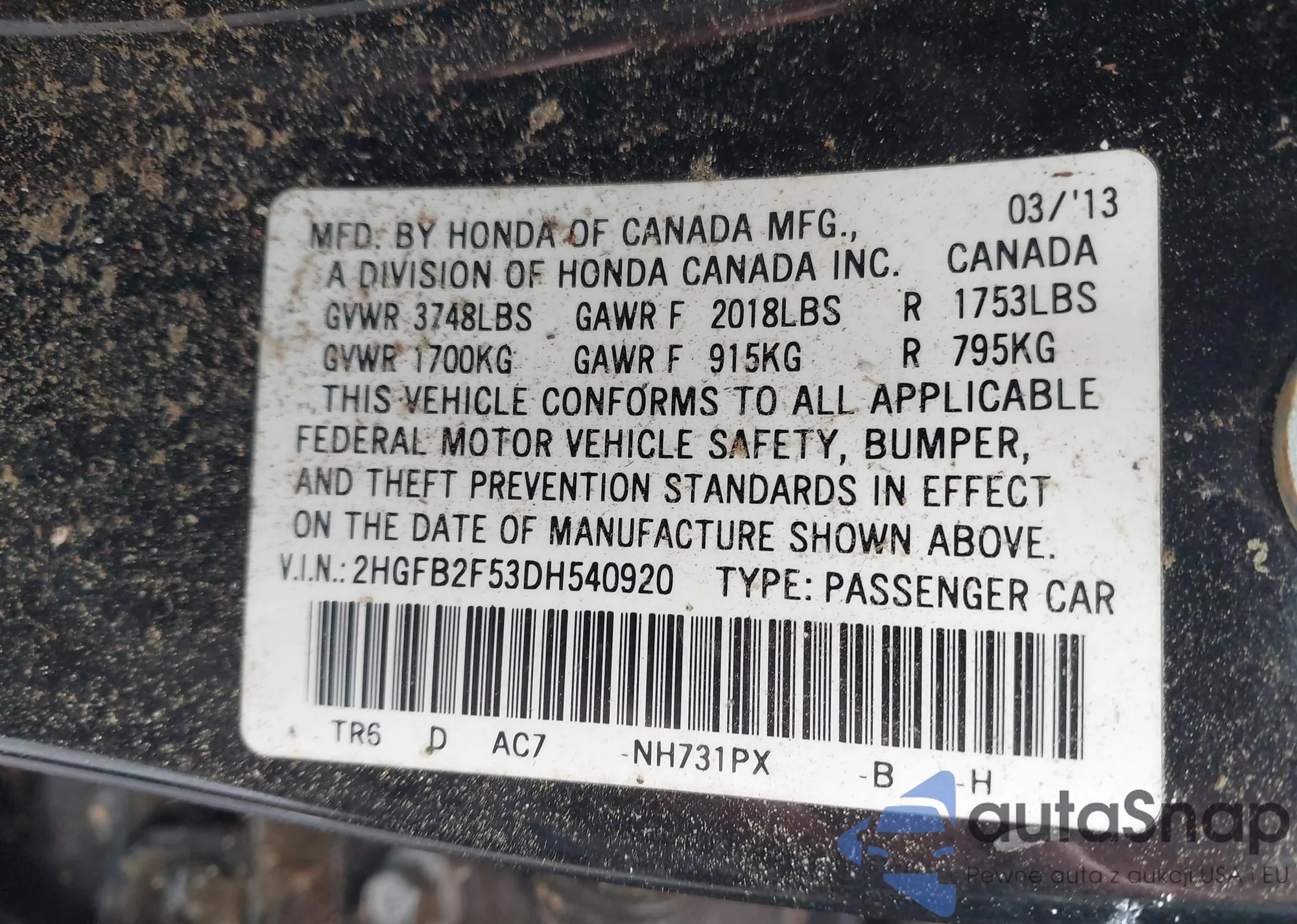 2013 Honda Civic Lx from USA, damaged, VIN 2HGFB2F53DH540920