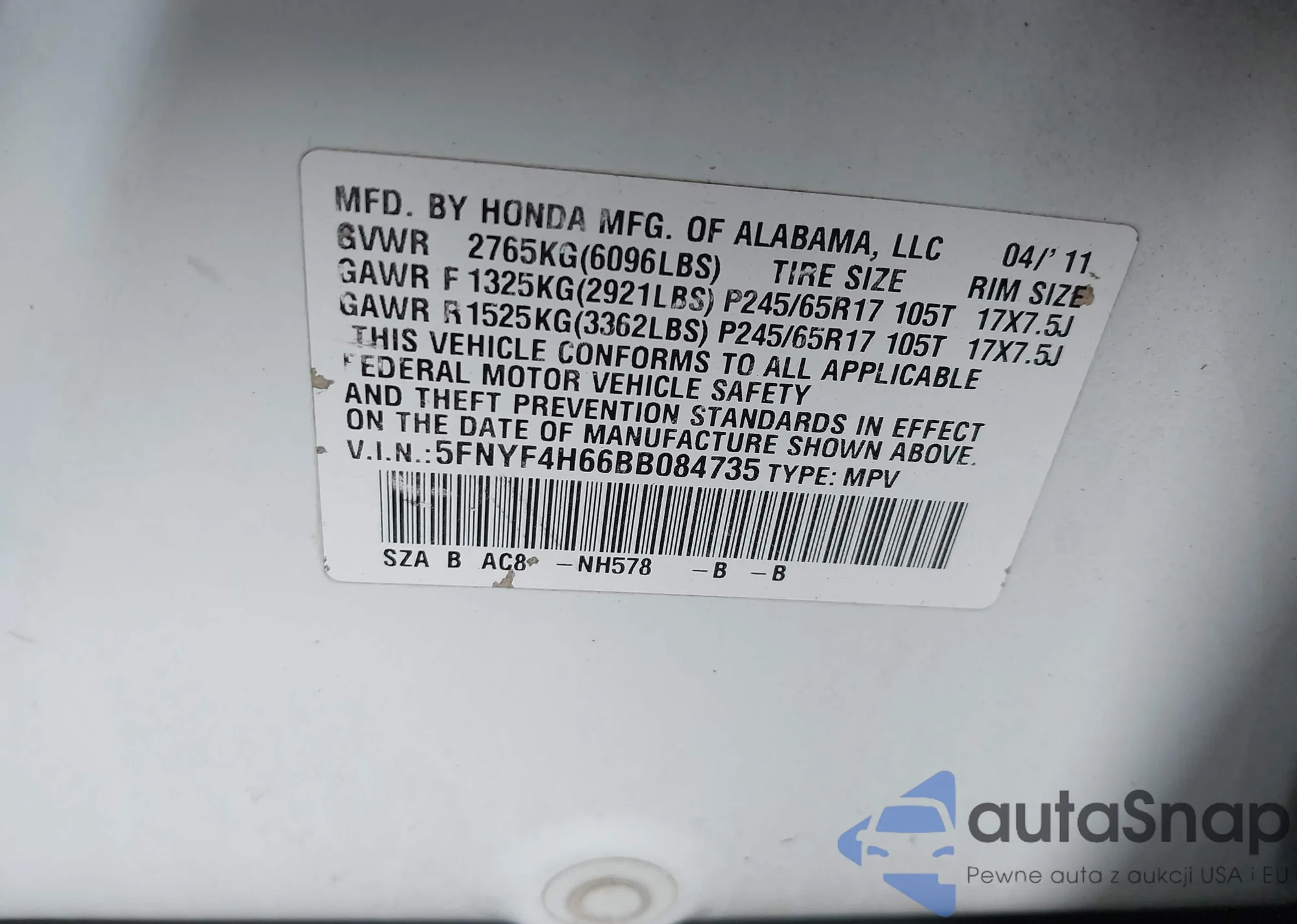 LOT: 43399191 VIN: 5FNYF4H66BB084735