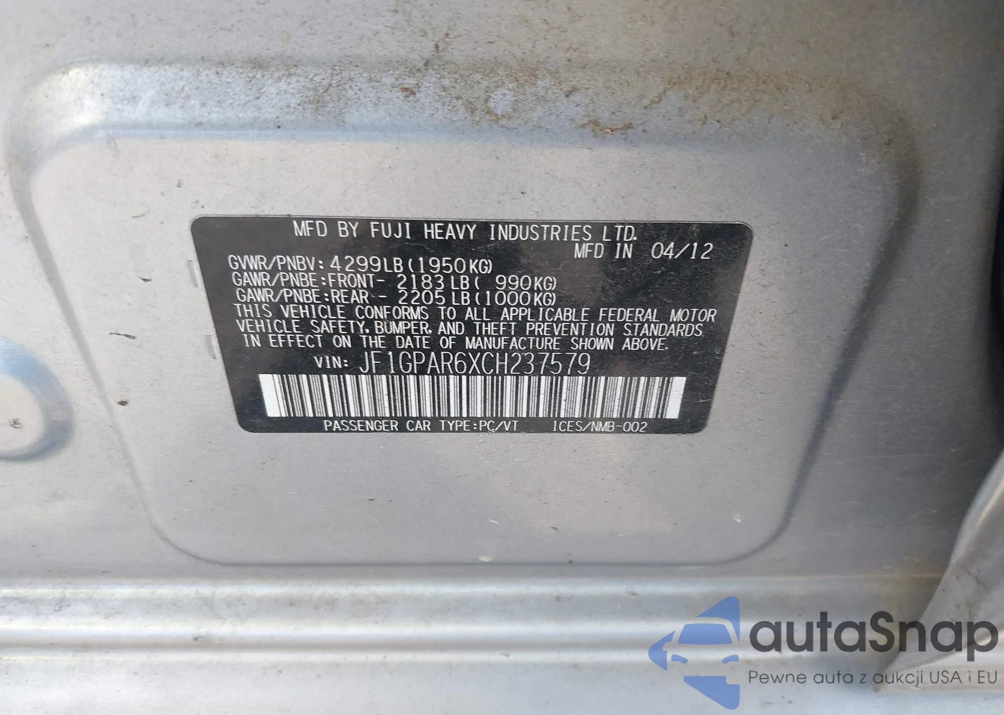 LOT: 43382233 VIN: JF1GPAR6XCH237579