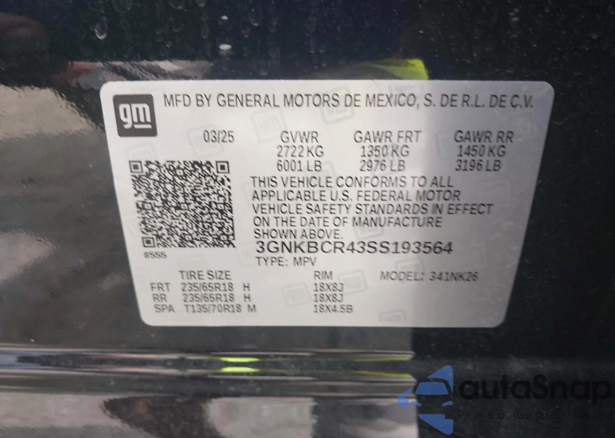 • VIN 3GNKBCR43SS193564