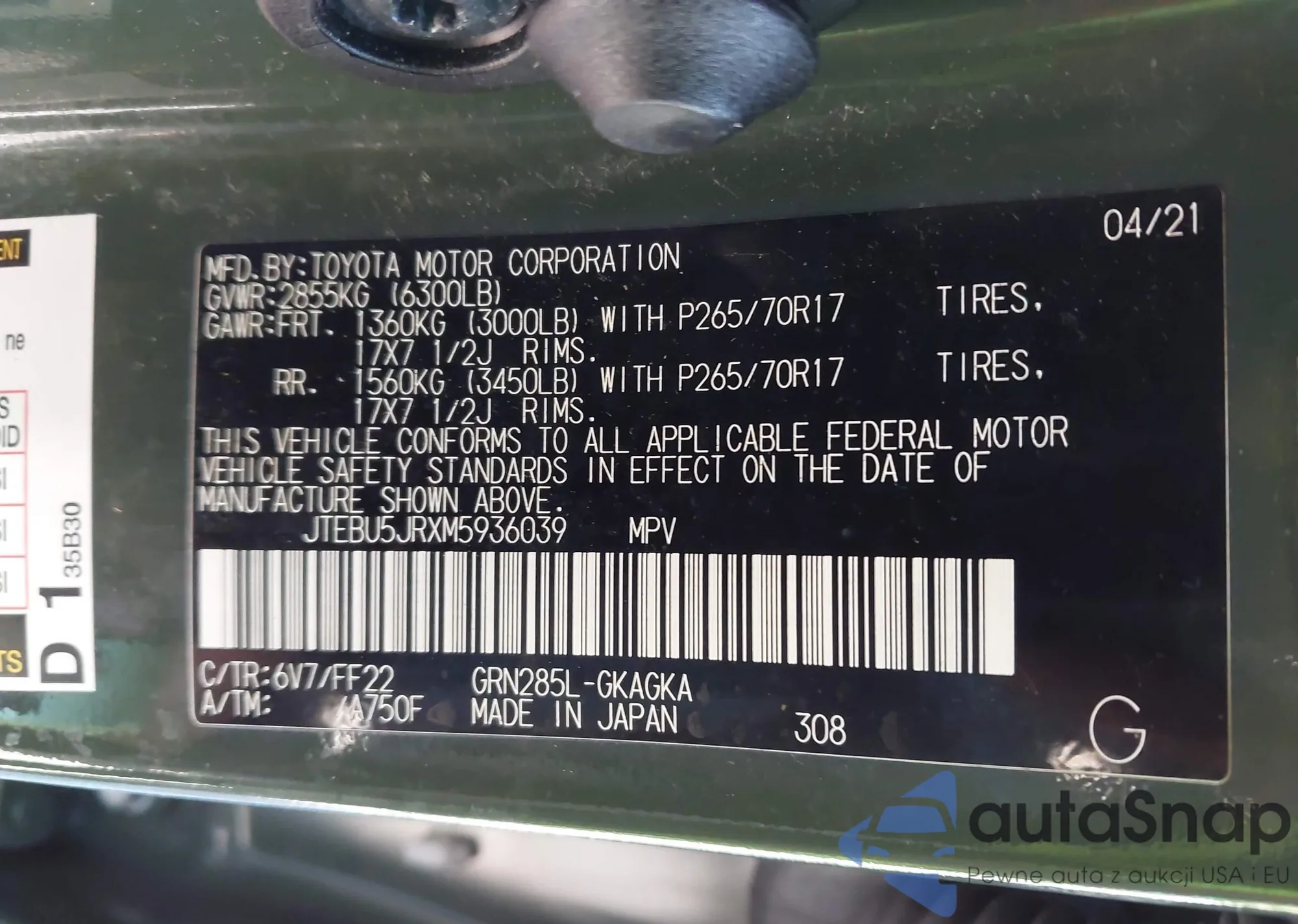 LOT: 43406412 VIN: JTEBU5JRXM5936039