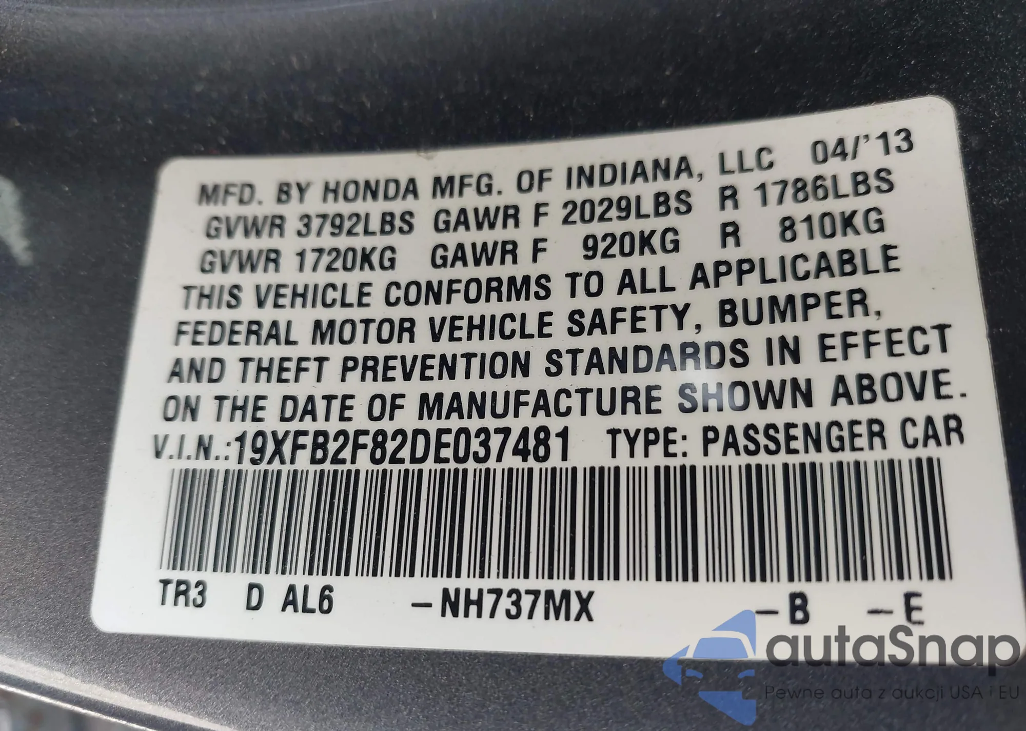 • VIN 19XFB2F82DE037481