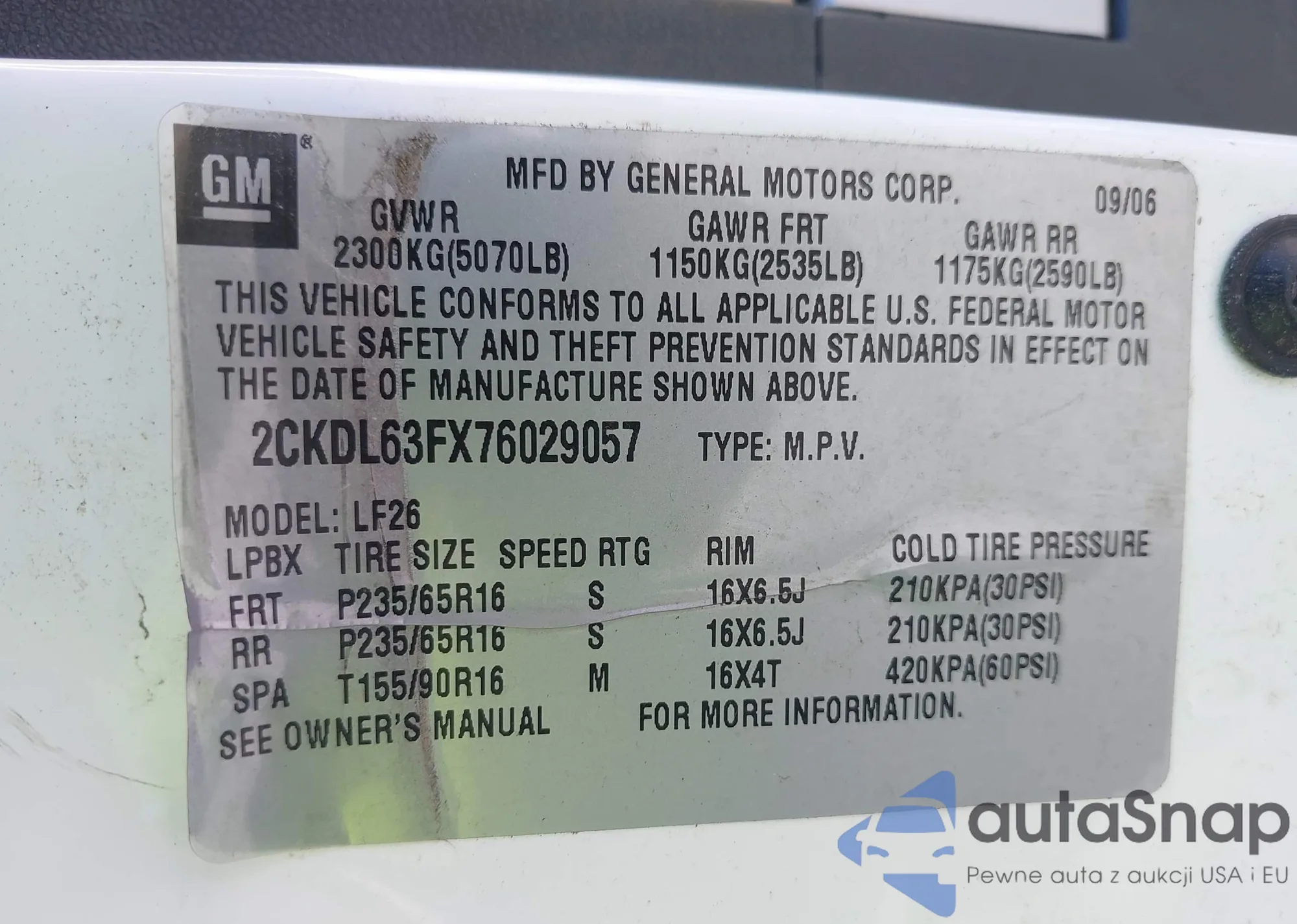 LOT: 43428850 VIN: 2CKDL63FX76029057