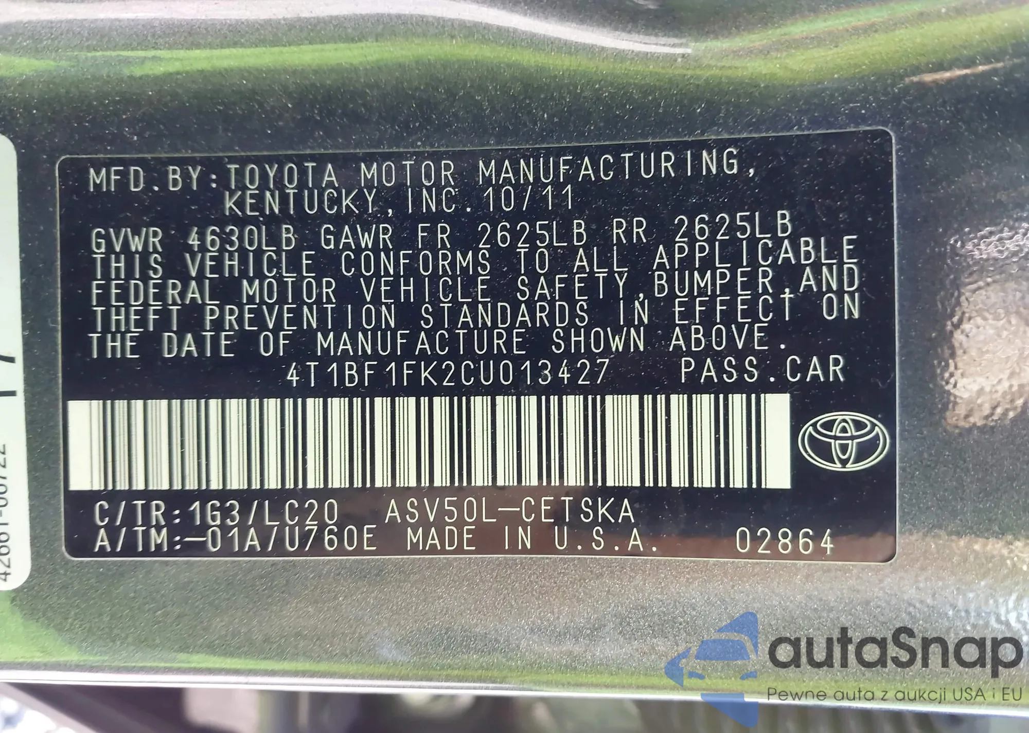 • VIN 4T1BF1FK2CU013427