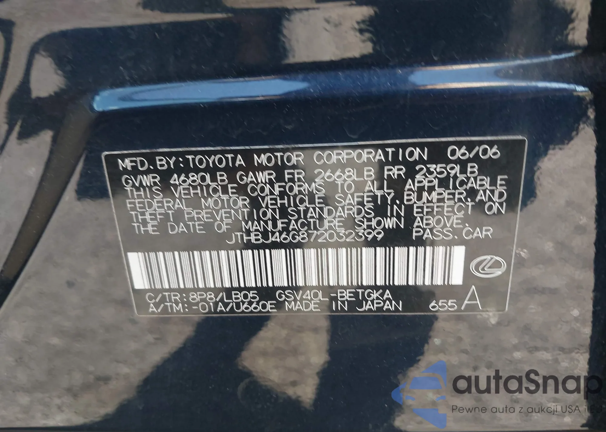 LOT: 43451281 VIN: JTHBJ46G872032399