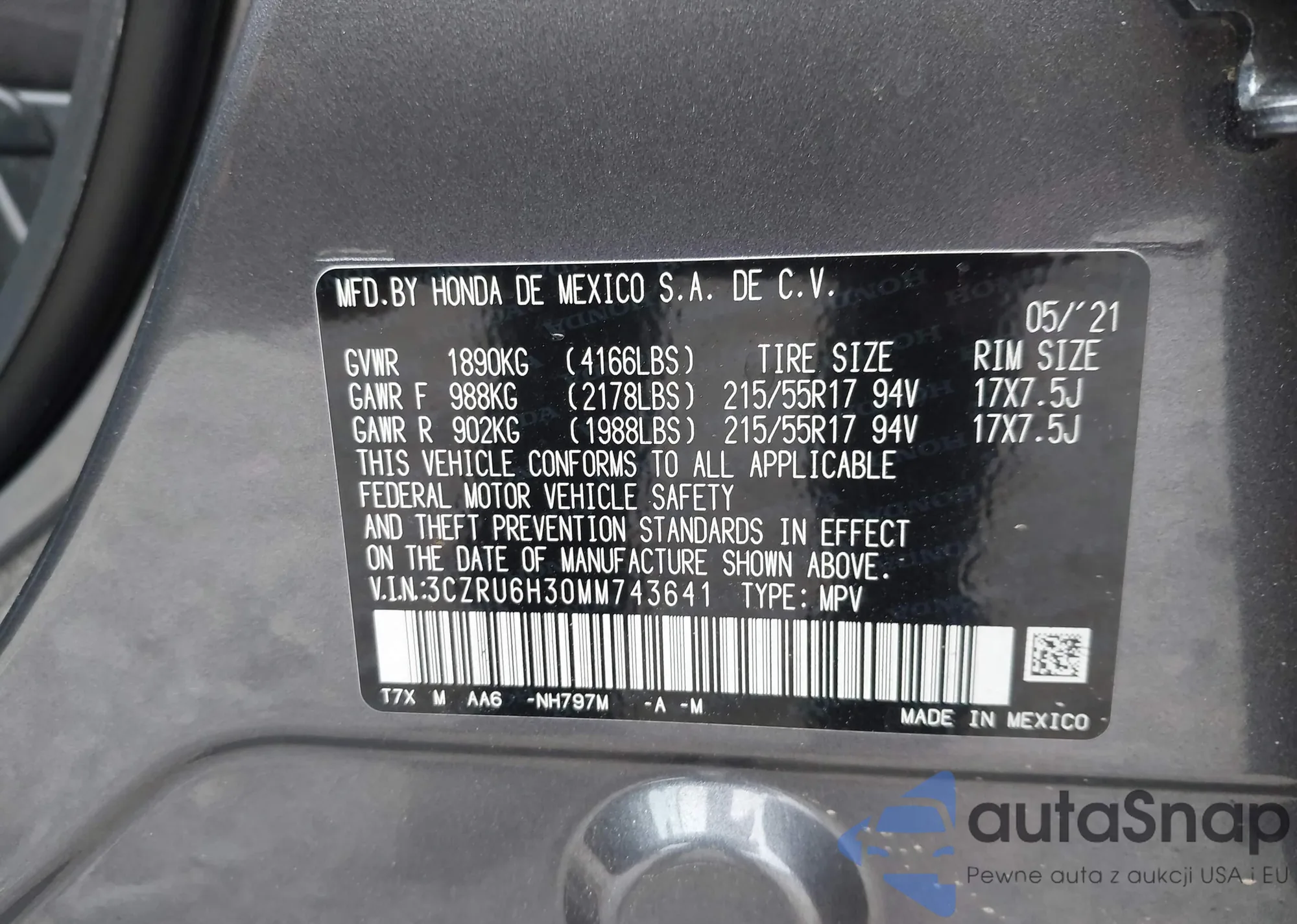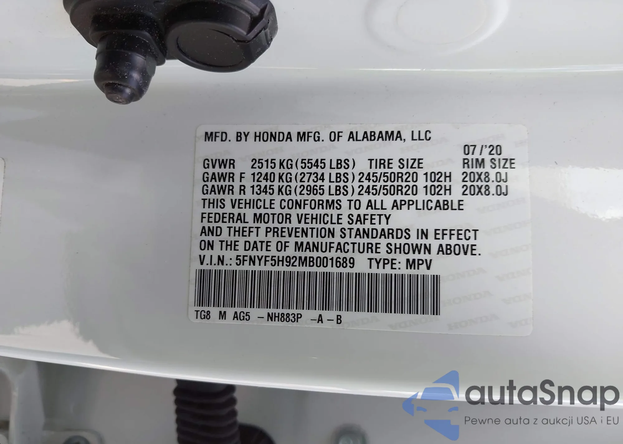 • VIN 5FNYF5H92MB001689