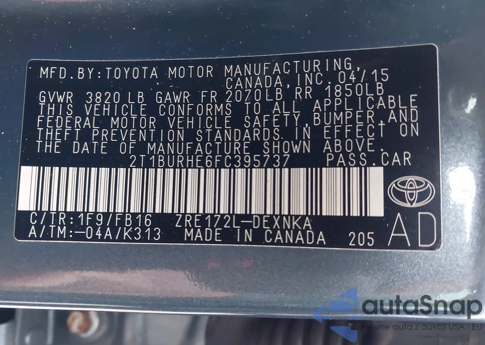LOT: 43376018 VIN: 2T1BURHE6FC395737