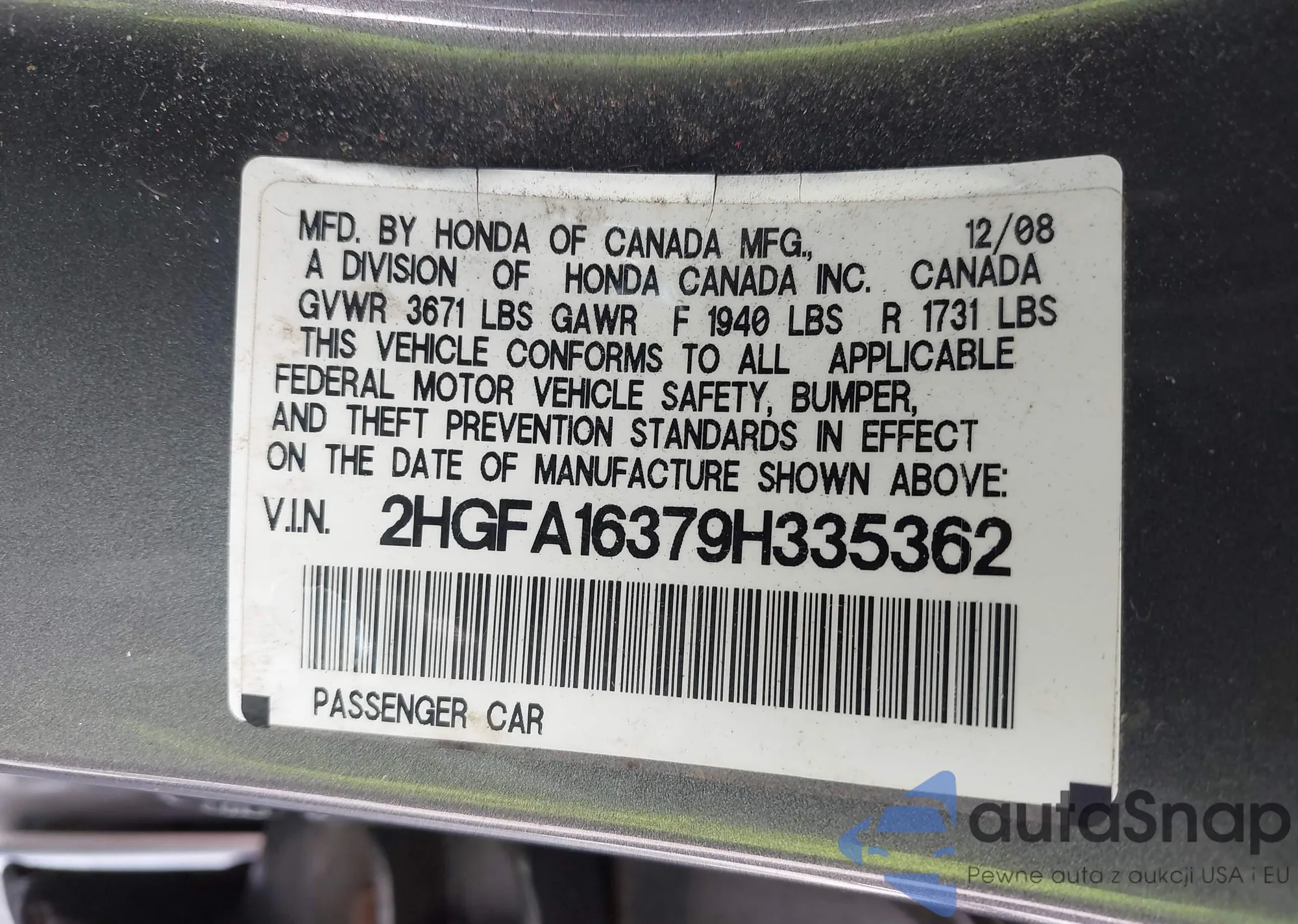 LOT: 43377739 VIN: 2HGFA16379H335362