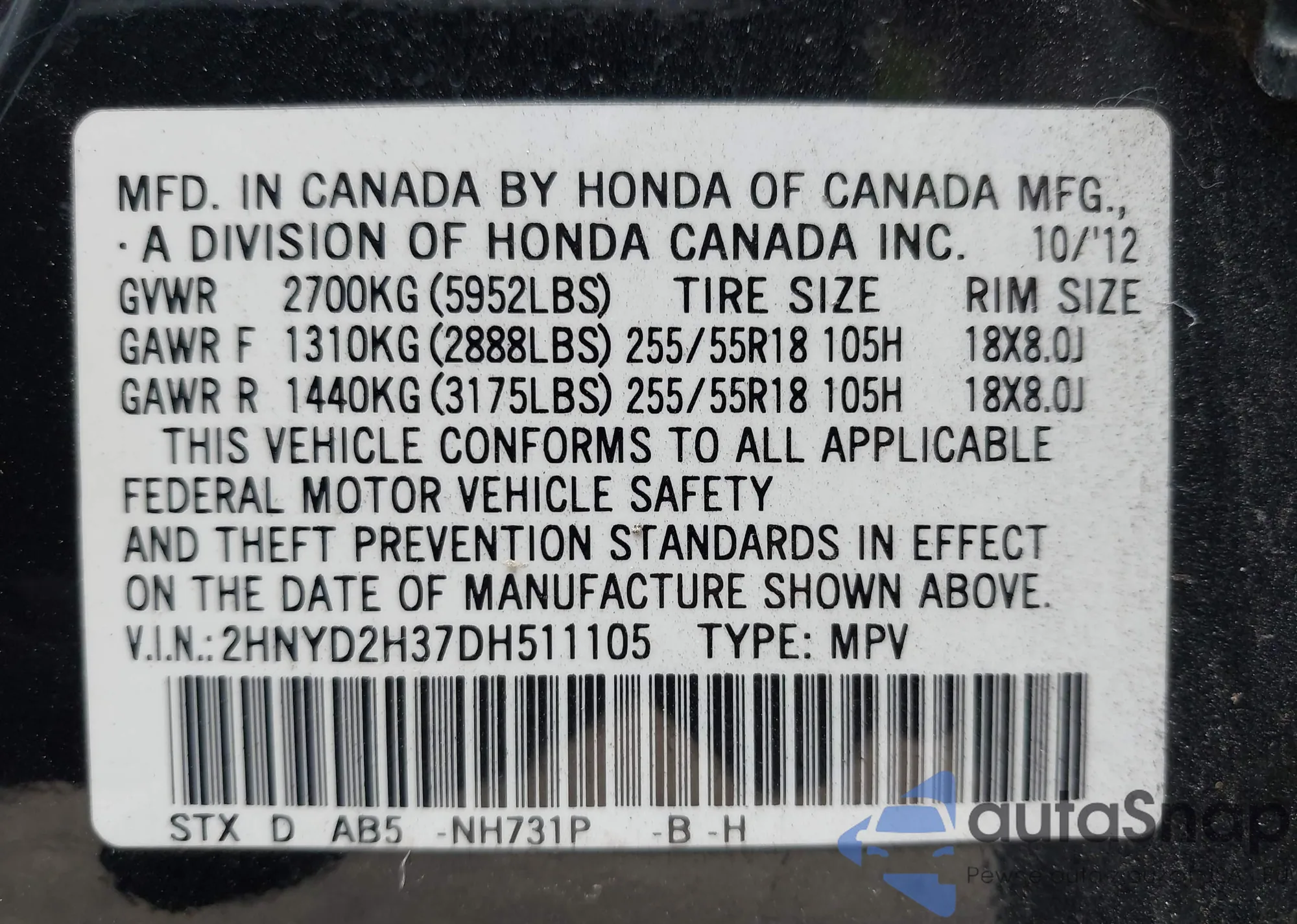 • VIN 2HNYD2H37DH511105
