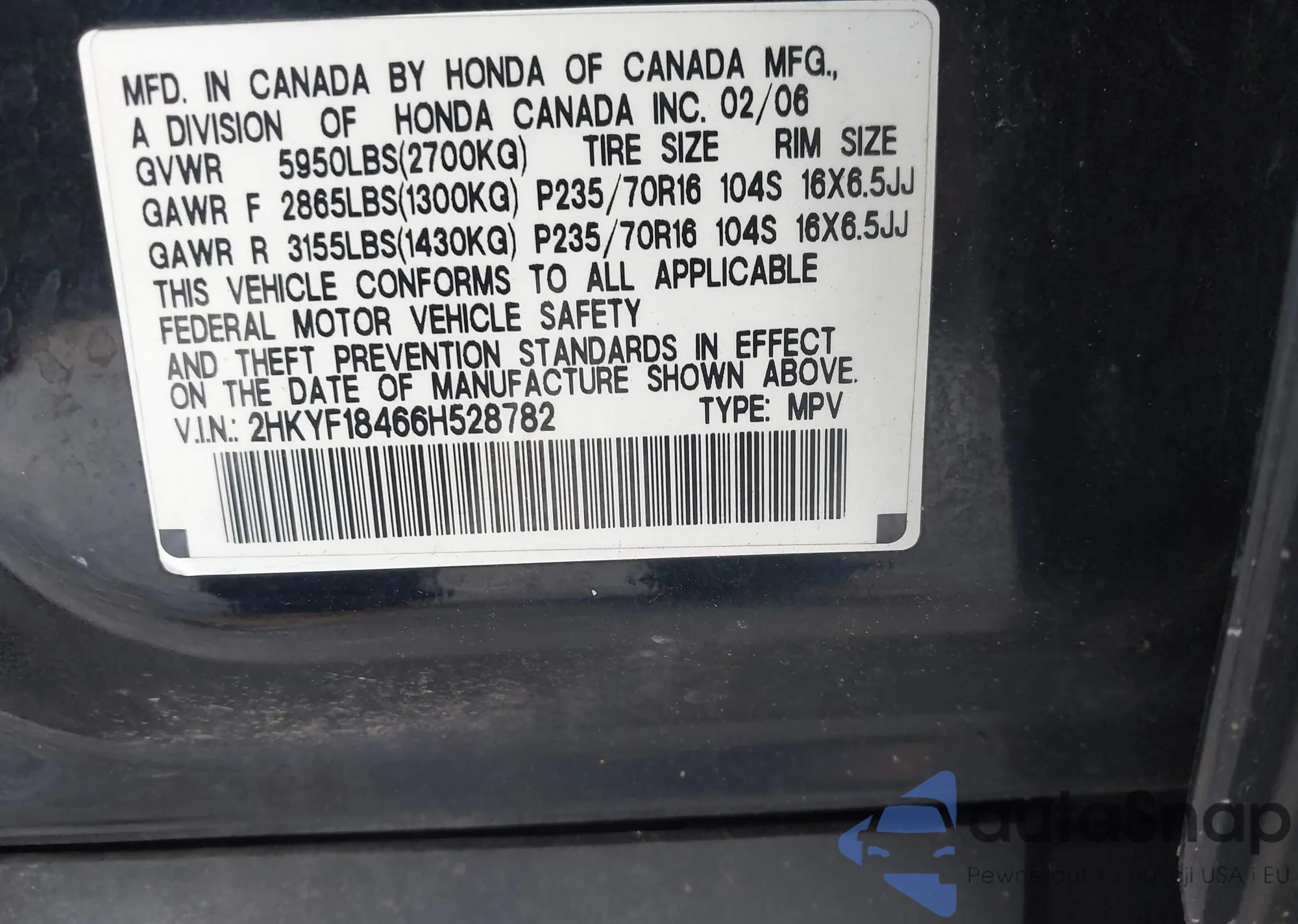 LOT: 42810506 VIN: 2HKYF18466H528782