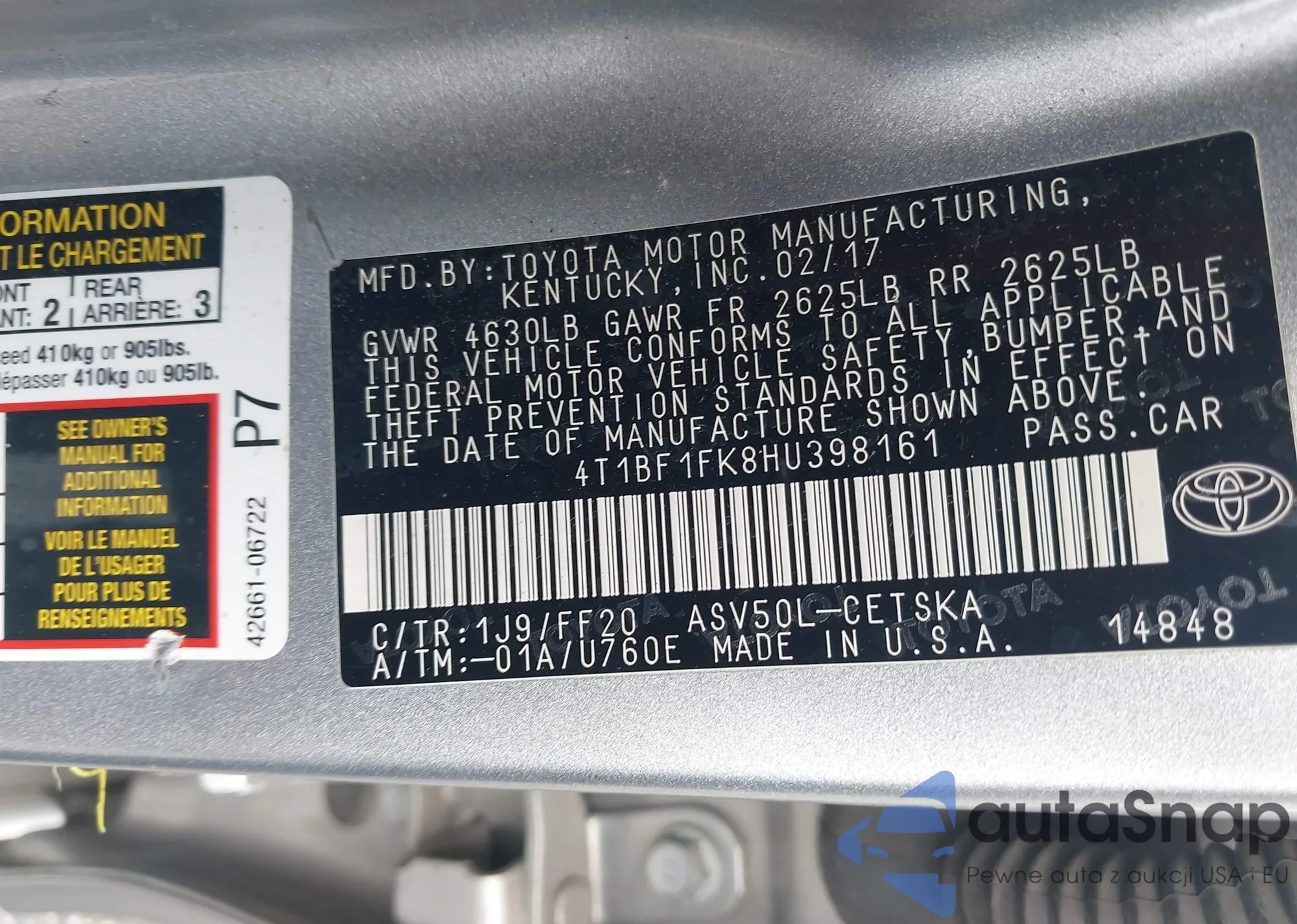 • VIN 4T1BF1FK8HU398161