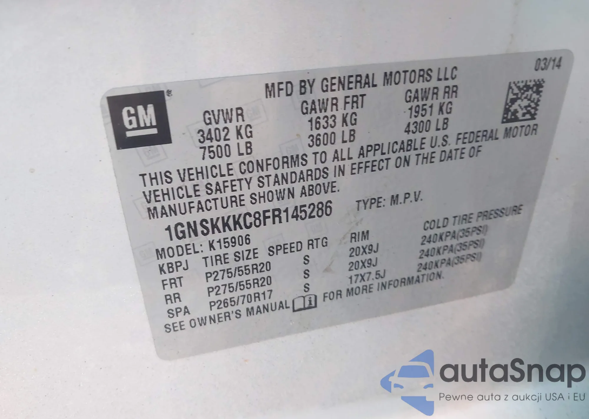 LOT: 43119290 VIN: 1GNSKKKC8FR145286