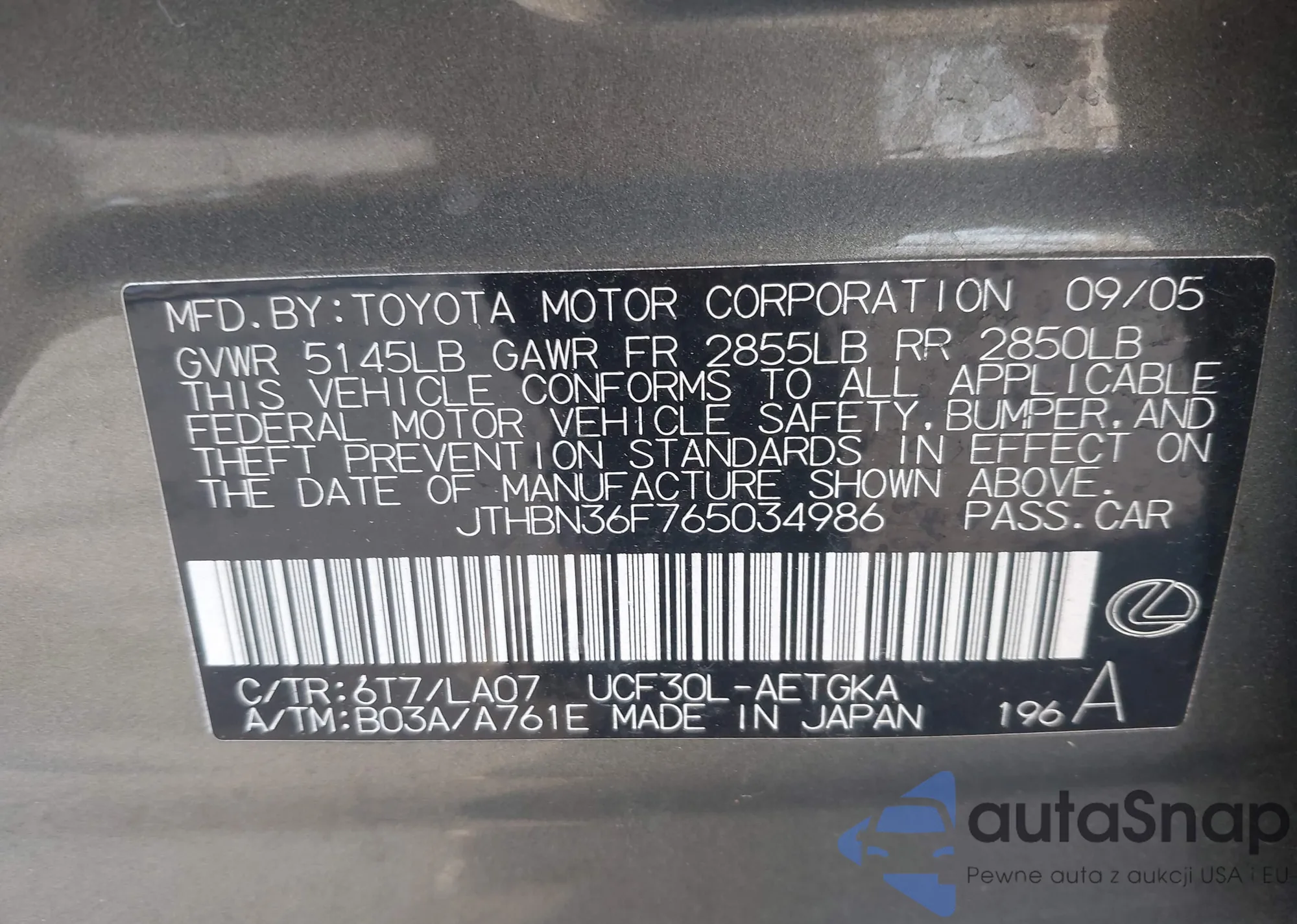 LOT: 43388146 VIN: JTHBN36F765034986