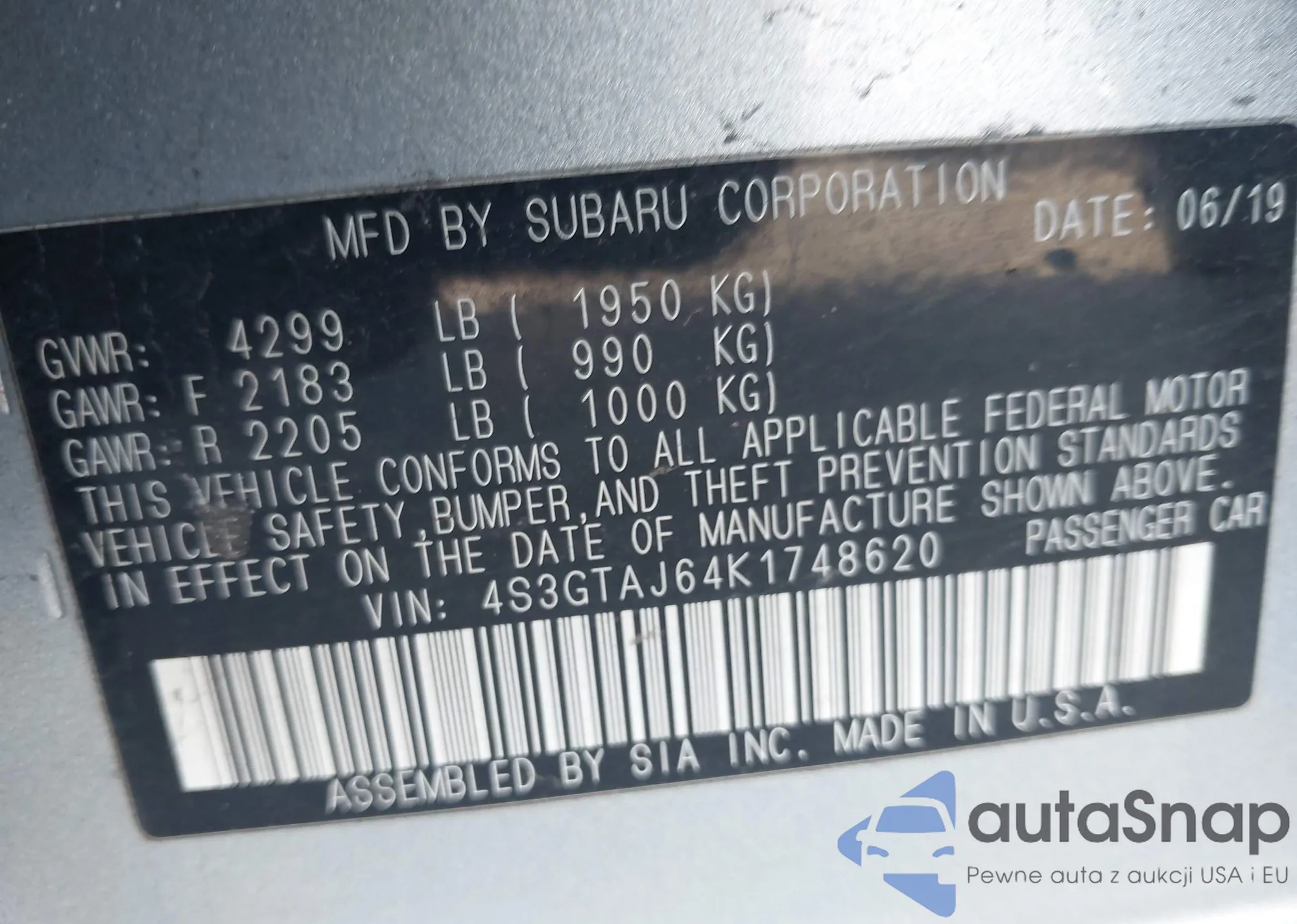 • VIN 4S3GTAJ64K1748620