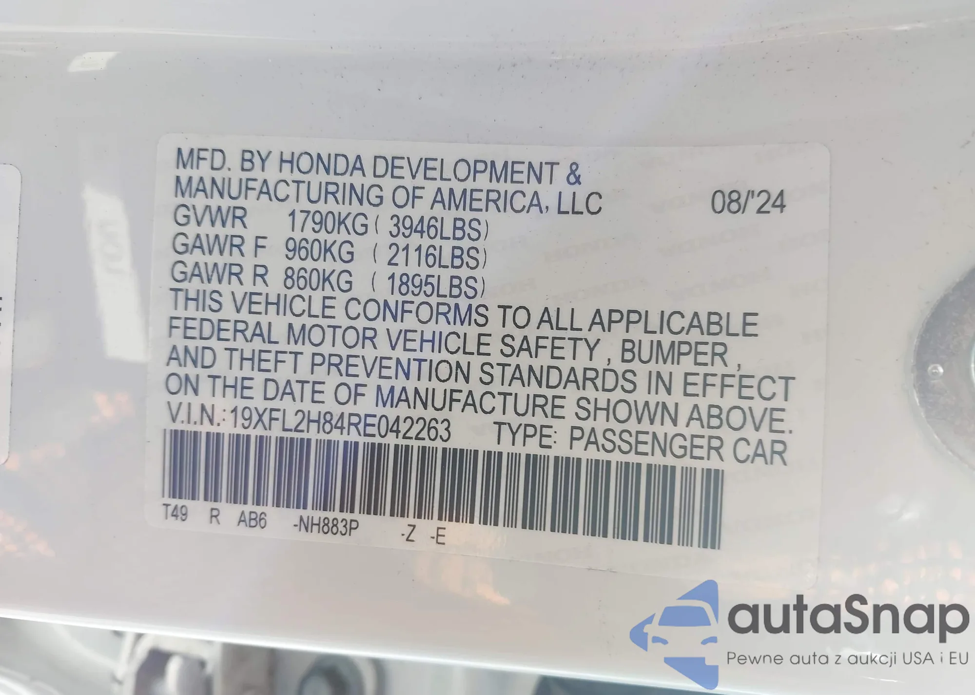 LOT: 42969494 VIN: 19XFL2H84RE042263