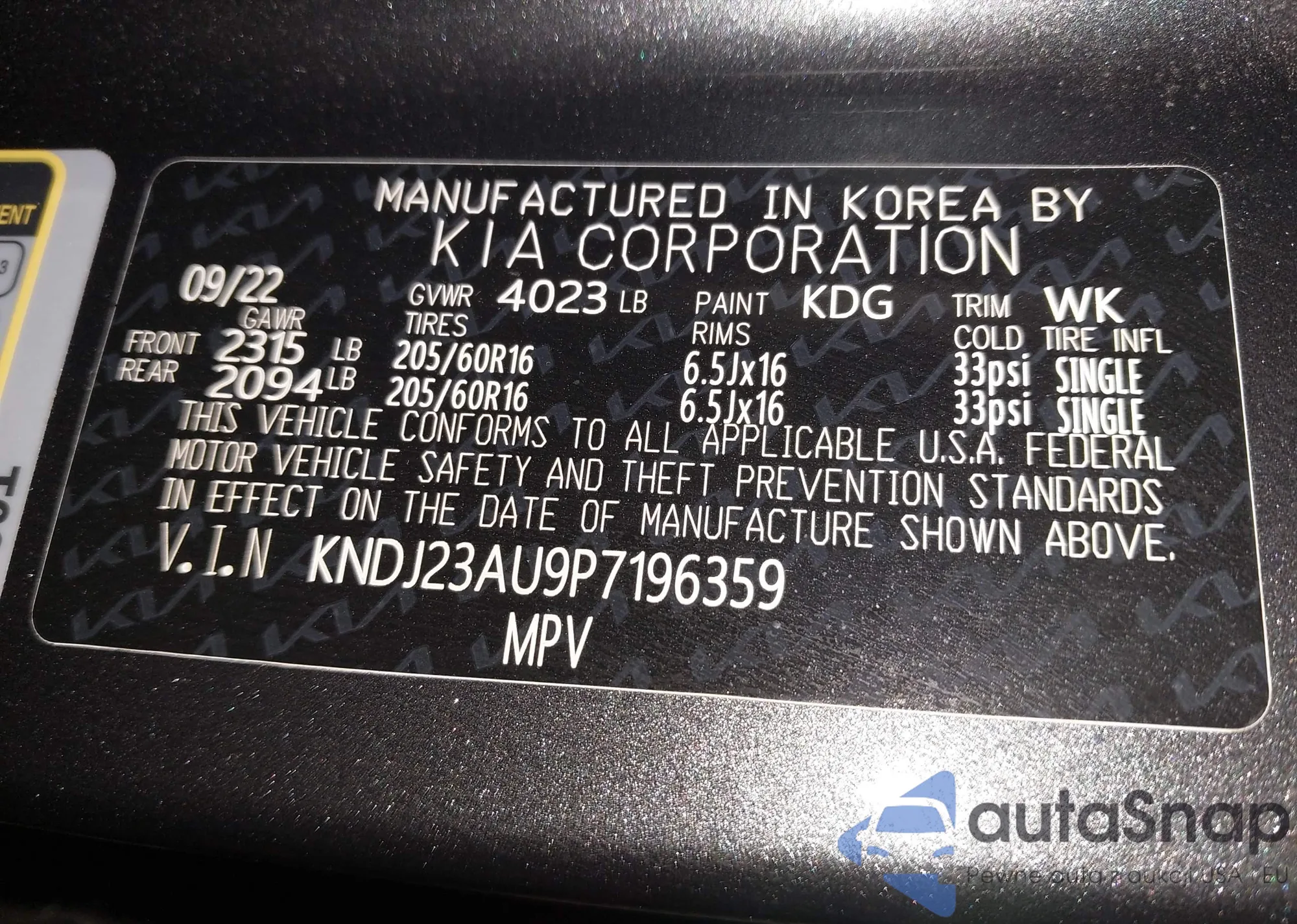LOT: 43018002 VIN: KNDJ23AU9P7196359