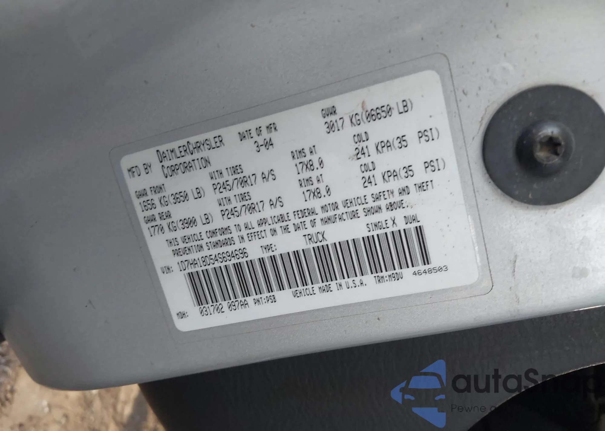 LOT: 43258346 VIN: 1D7HA18D54S694696