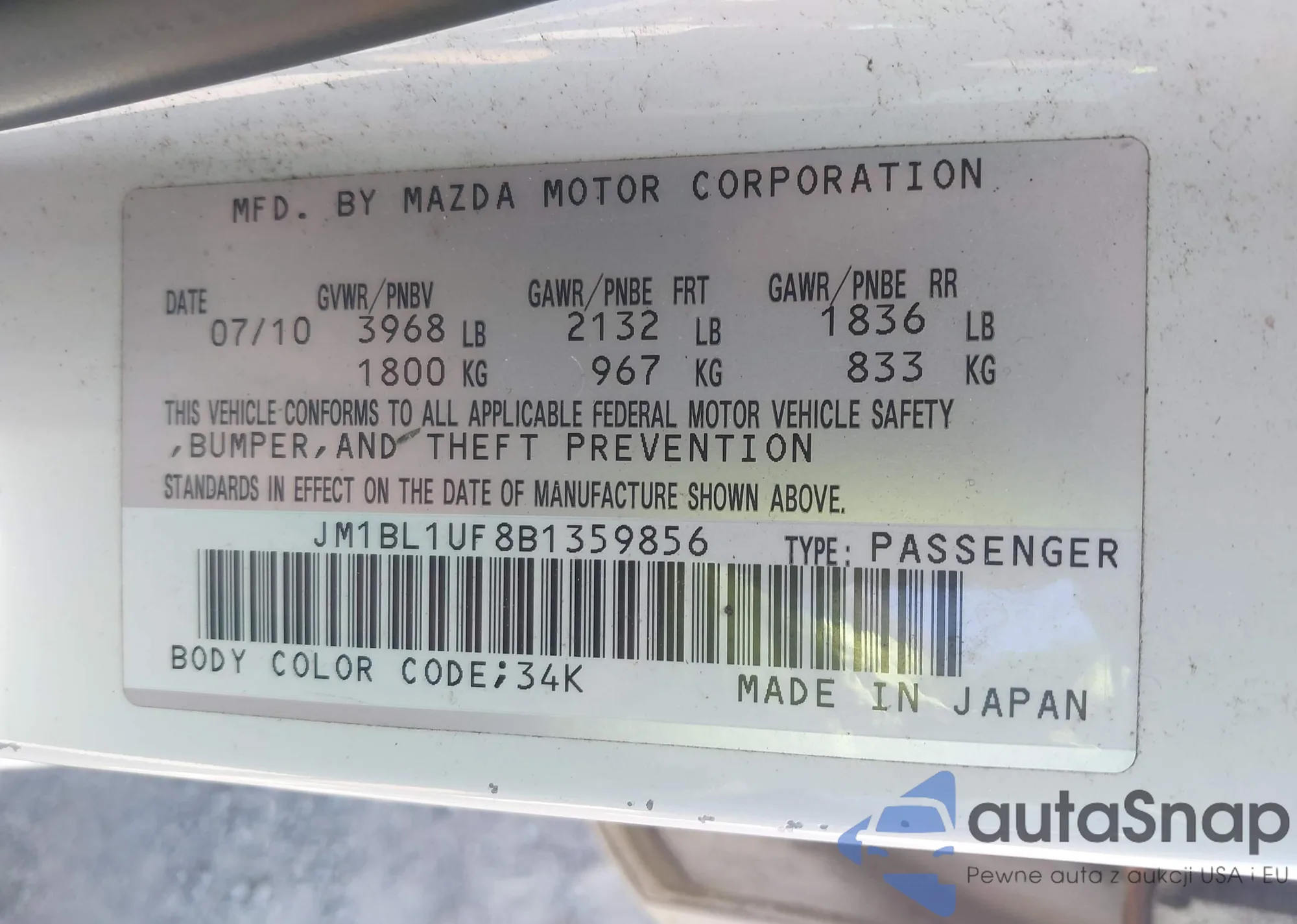 LOT: 43385312 VIN: JM1BL1UF8B1359856