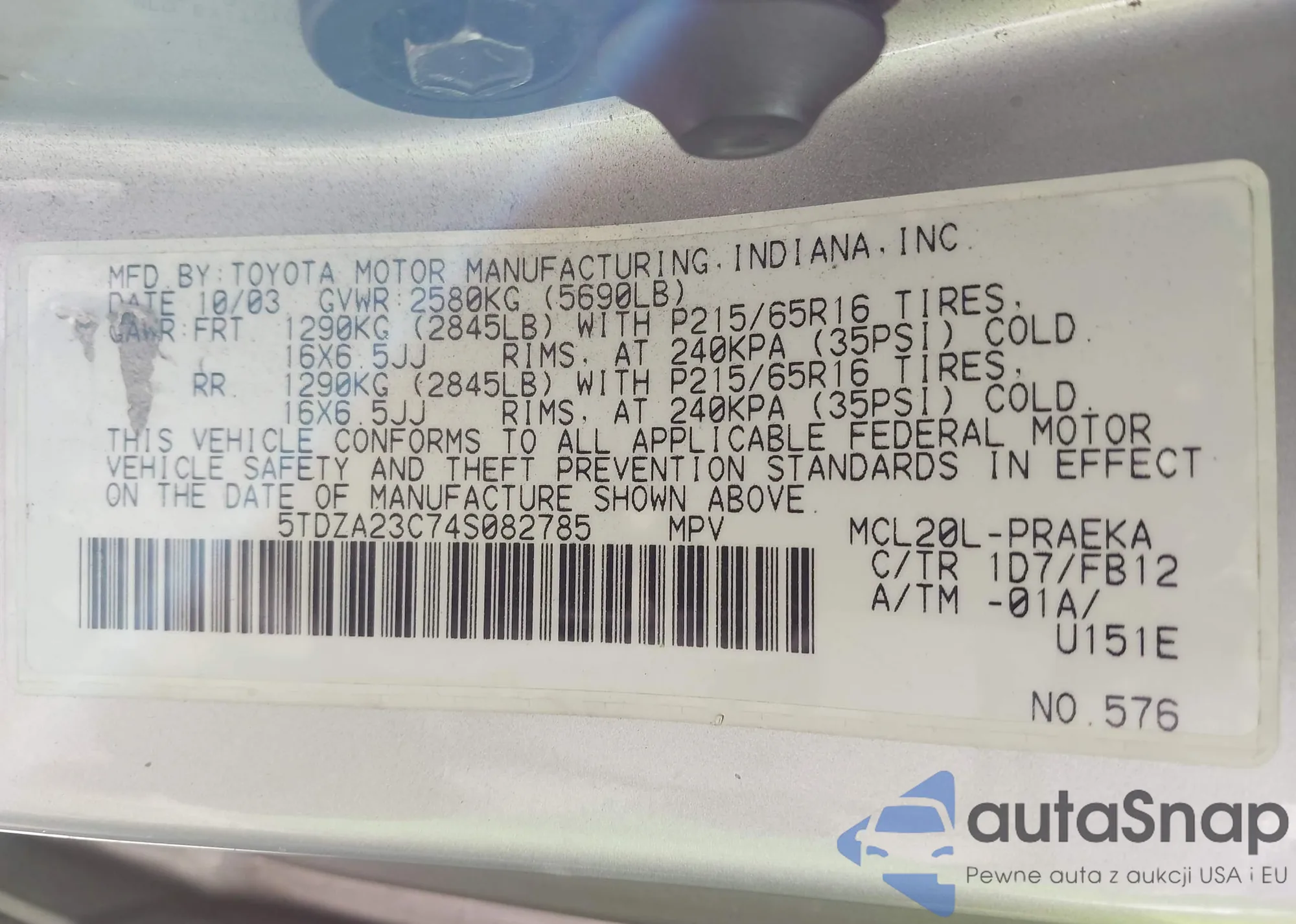 LOT: 43469036 VIN: 5TDZA23C74S082785