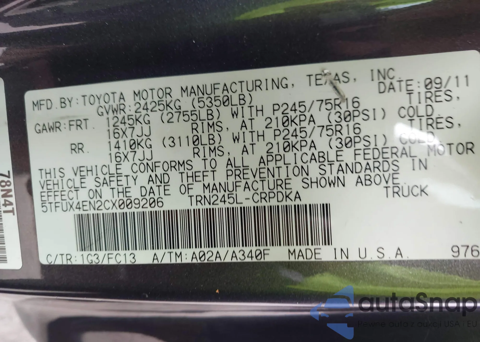 • VIN 5TFUX4EN2CX009206