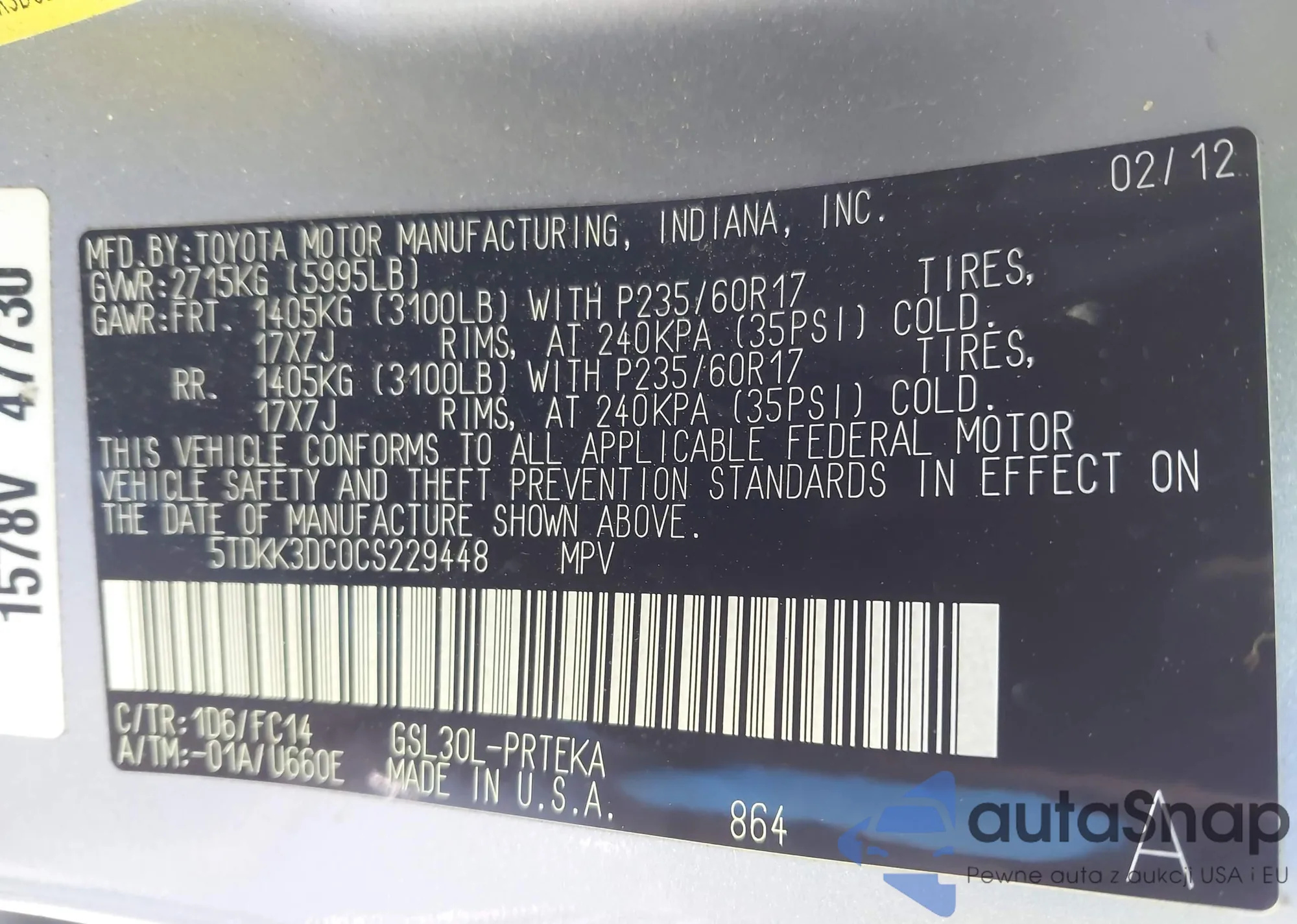 LOT: 43471913 VIN: 5TDKK3DC0CS229448